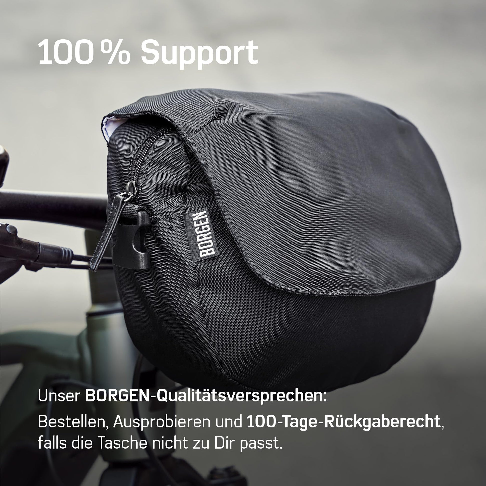 "OUR PROMISE - We believe in quality that pays off. That's why you receive our Borgen Satisfaction Promise on the KLICKfix handlebar bag - 100% satisfied or 100 days return policy"]
