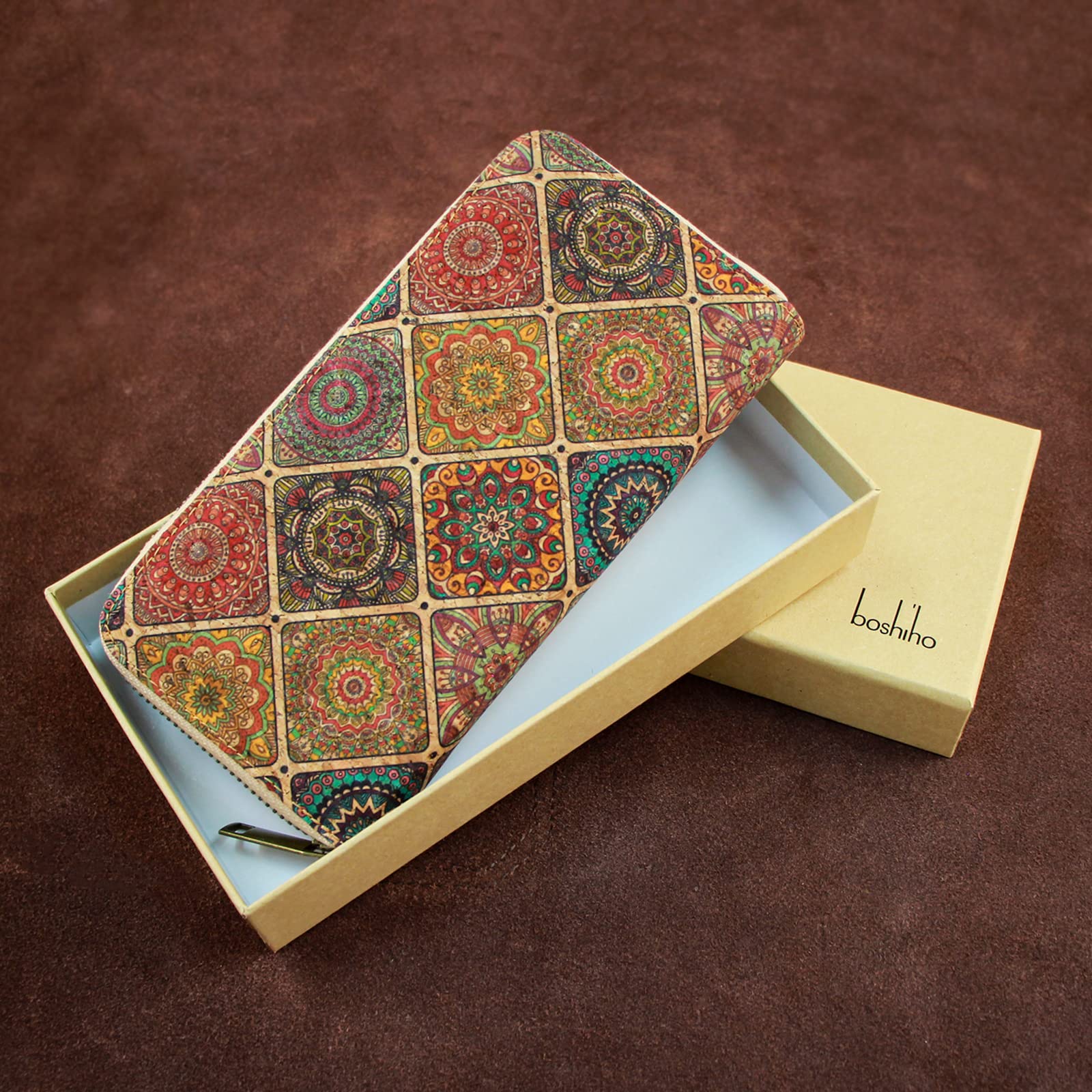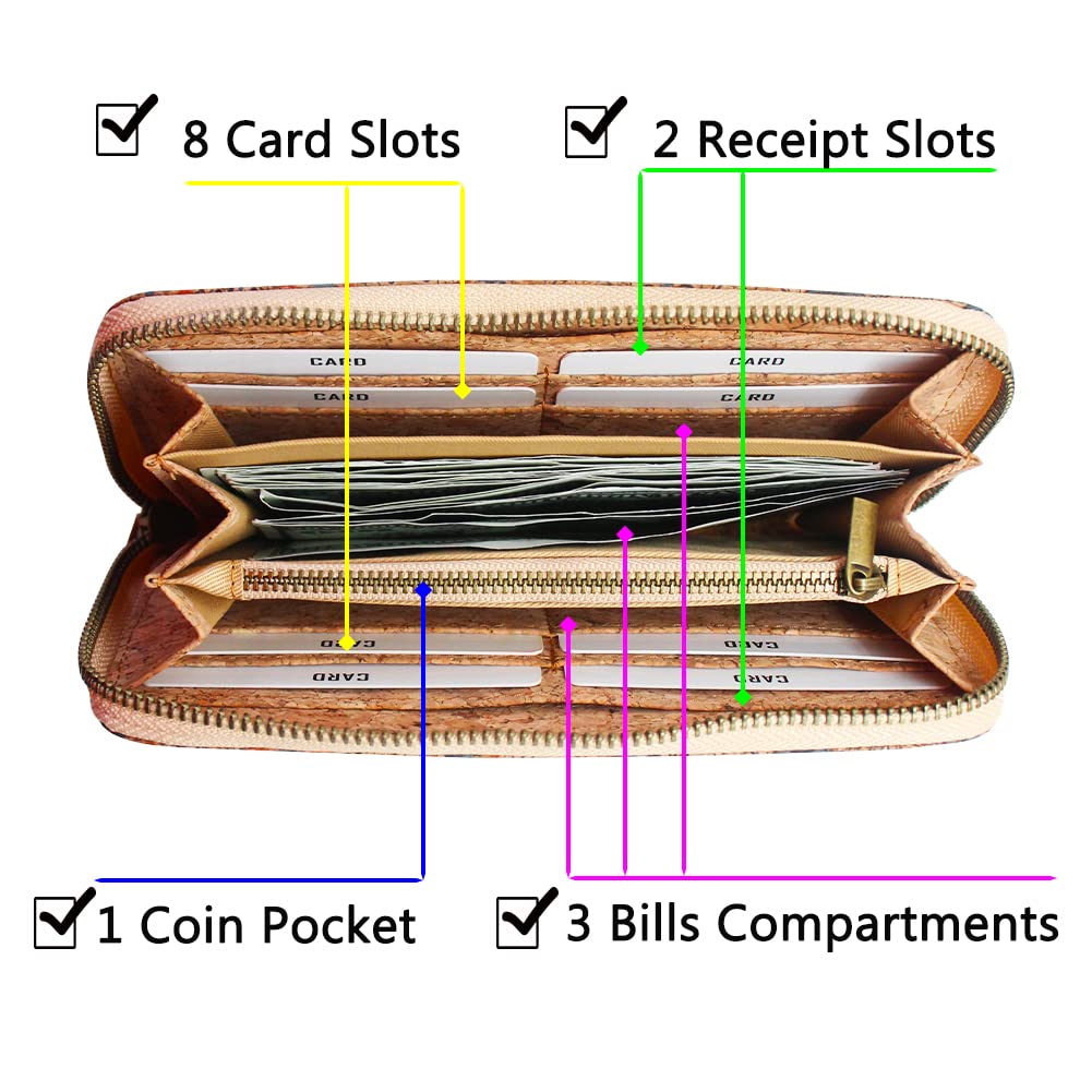 ["Eco-friendly women's wallets without leather: feels soft and made from natural cork. Very elegant, stylish purse allowing you to see and feel the beautiful, colorful cork fabric.","Versatile cork wallet - 8 card slots, 1 zippered coin pocket, 2 slots for mini receipts, 3 full-length compartments for phone, paper money. Smooth zipper with key strap design","VEGAN HANDBAG CLUTCH - Dimensions 19 x 9 x 2cm; no animal products, 100% animal-free, ideal gift for vegans and vegetarians. Includes: 1 x cork wallet with beautiful cardboard gift box","RFID wallet: prevents your valuable information like credit cards from being stolen by RFID blocking function, from high-tech thieves using card readers to scan your financial data from wallet or purse.","Ideal gift for women: With its appealing design and functional structure, this wallet makes a great gift for women on various occasions."]