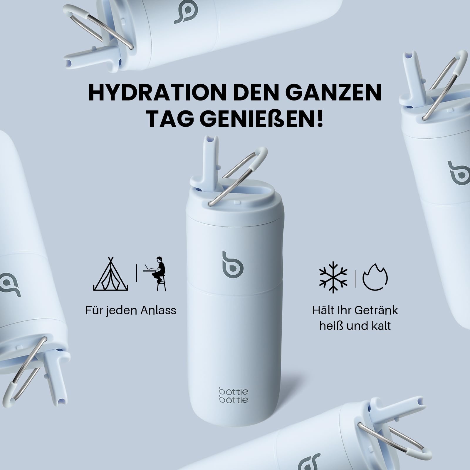 ["1. Variety of colors Our stainless steel water bottle impresses with its high quality and functionality. It is available in a wide range of modern and attractive colors, making it suitable for people of all ages and for various uses.","2. Practical lid with dual function The stainless steel water bottle has a collapsible straw that allows for convenient drinking. A straw cleaning brush ensures effortless cleaning. Additionally, the straw lid has a collapsible handle that makes carrying on-the-go easier.","3. Double-wall design Our double-walled, durable stainless steel bottle keeps hot drinks like coffee or tea warm for a long time and ensures that cold drinks with ice cubes stay fresh longer.","4. BPA-free stainless steel Our 18/8 stainless steel is environmentally friendly and aligns with our brand's philosophy of protecting the environment. Customers can use this product without hesitation as it is free of Bisphenol A and other harmful chemicals.","5. Warranty on our water bottle Our customer service is always available to assist you. If you have any questions or concerns about our products, do not hesitate to contact us."]