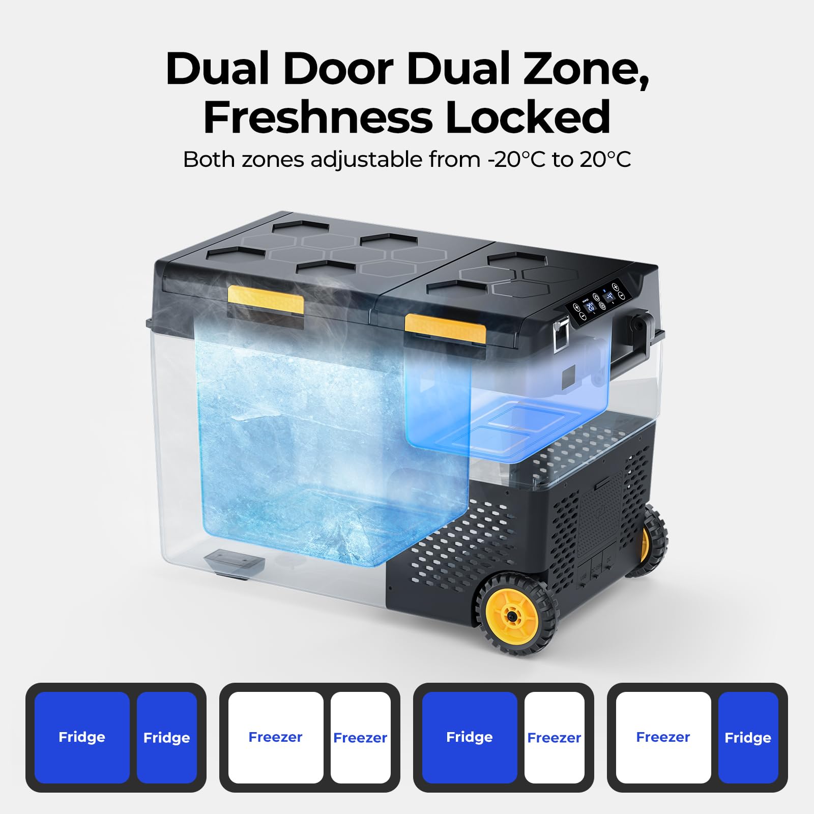 ["Two Zones and Double Door"] This BougeRV CRD2 cooler box offers you maximum flexibility: Two separately controllable zones (-4°F to 68°F) and double doors prevent the mixing of temperatures and odors. Choose from 4 modes: freezer/fridge, fridge/freezer, two freezers, or two fridges. You can also turn off one zone.