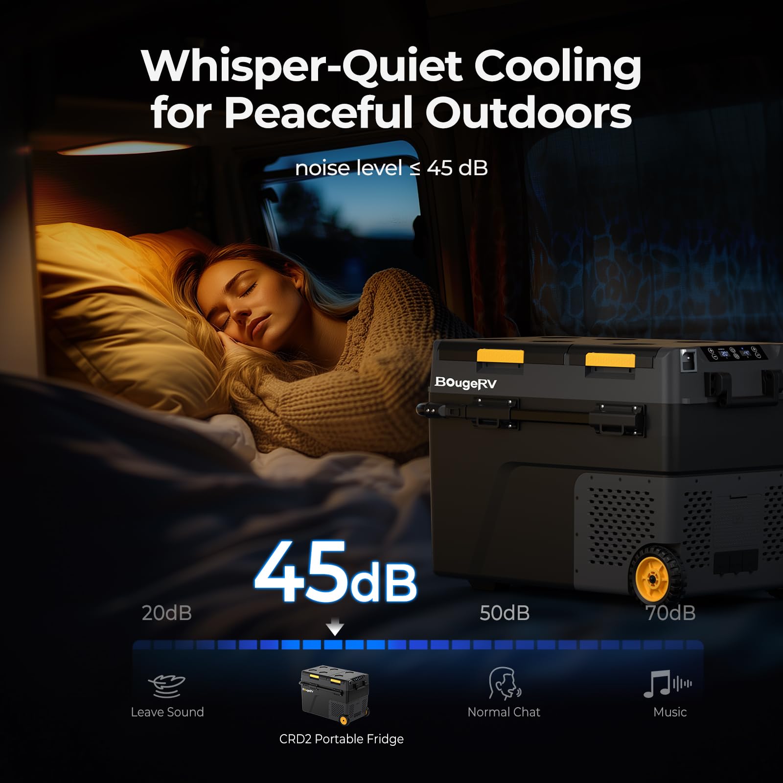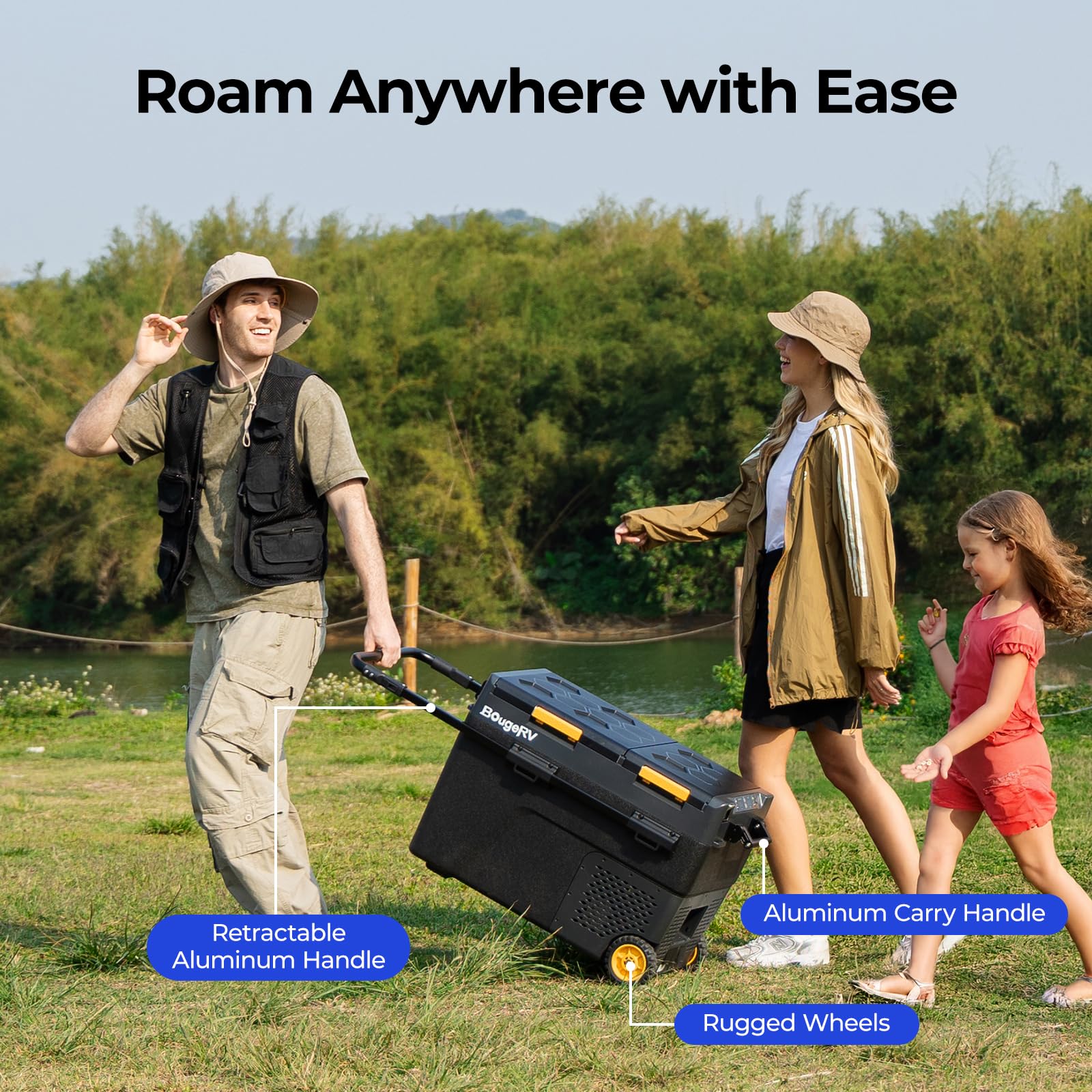 BougeRV CRD2 compressor refrigerator 49L with freezer compartment, dual doors, dual zones (improved aluminum handle). Car fridge with wheels, 12V/24V 230V, camping electric cooler with APP control, -20°C~20°C.