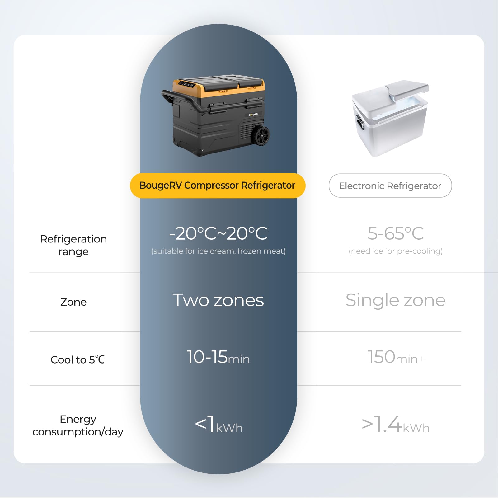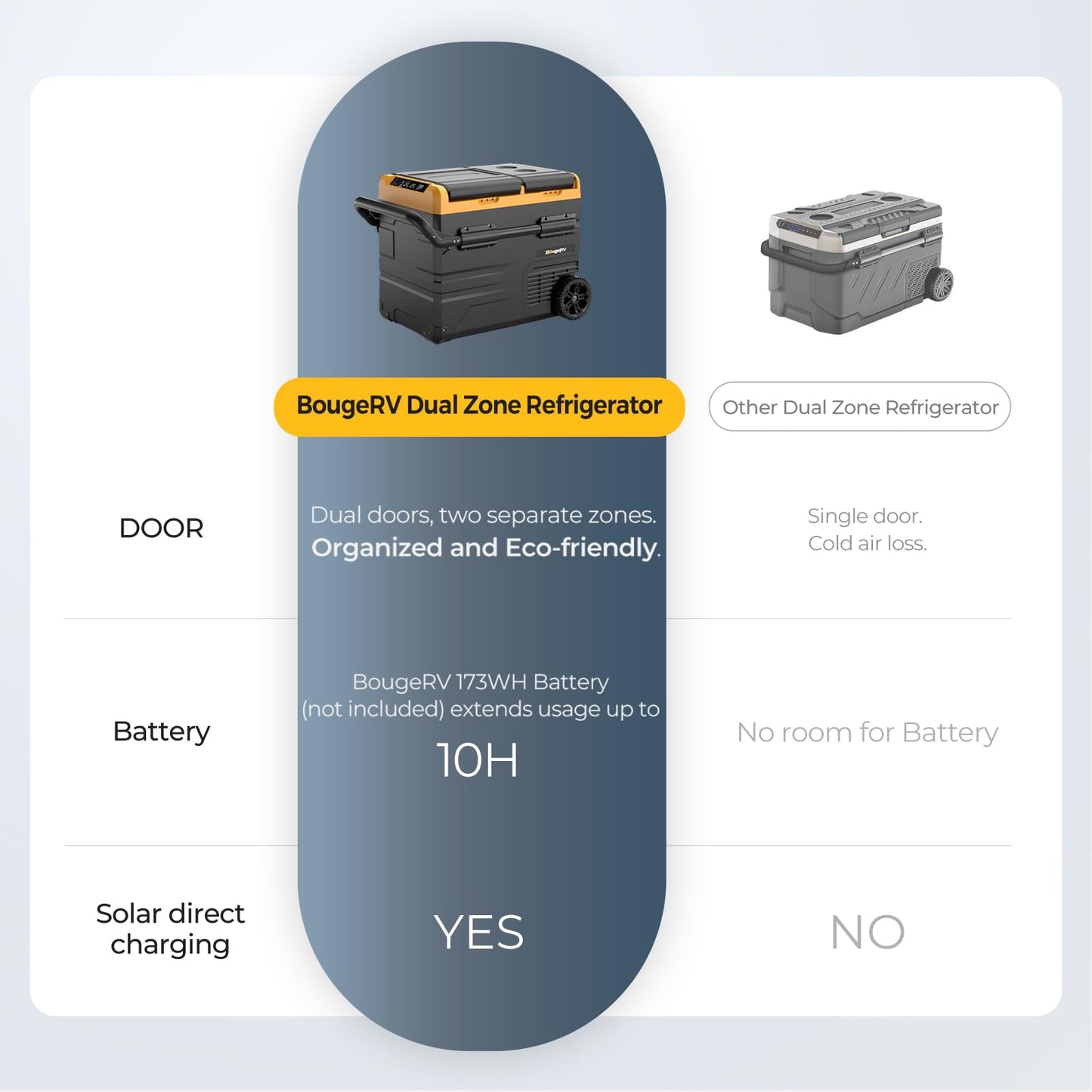 "【BougeRV 173-Wh Battery Extends Usage Time】With the 173-Wh battery (Search for BougeRV to purchase), the car refrigerator can run for up to 10 hours longer without the need for additional power connections. Relieve your car's engine and reduce energy waste when traveling overnight.",