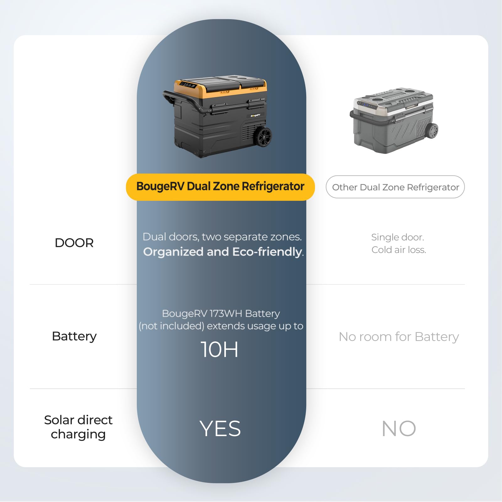 "【Solar Panel Direct Charge】BougeRV Car Cooler Box 12V 230V + 173-Wh Battery + 5521 Adapter Cable + Solar Panel. With this set, you can charge the refrigerator directly with the solar panel without additional electricity bills, saving 220 kWh per year. No power plant. Less effort in exploration. ECO-travel solution.",