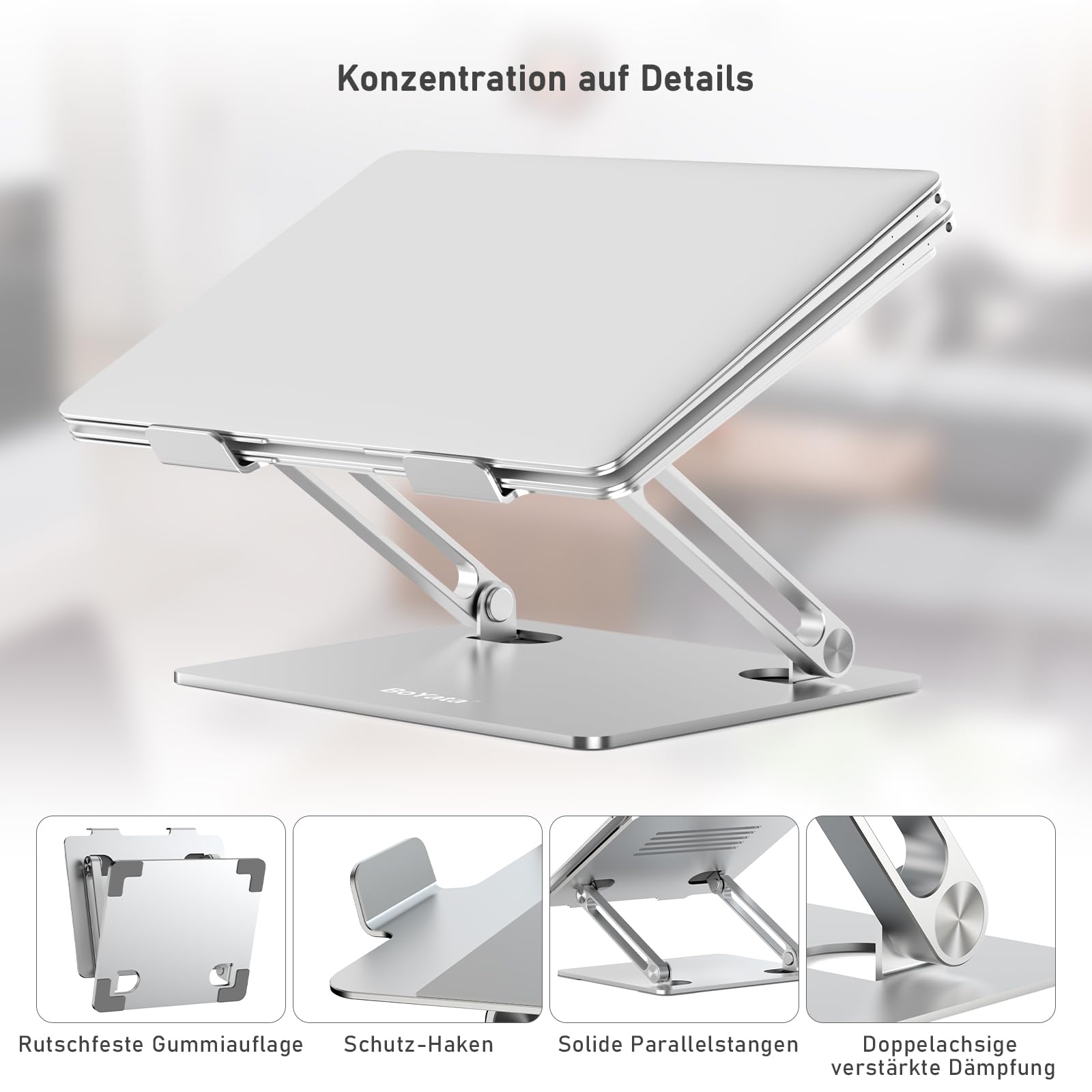 ["【Positioning Flexibility】 The BoYata laptop stand is sturdy and adjustable from 0°-90° to give you the flexibility you need. This stand raises your computer, giving you more space on your desk for work and other items.","【Designed for Stability】 With a perfect combination of texture and unique design, this stand offers style and durability. The large surface of the silicone pads helps prevent slipping and improves overall stability. Protective hooks on each arm also keep your laptop from sliding towards you during use.","【Ergonomic Design for You】 The Z-type design allows for adjusting the ideal height for typing and other projects. The laptop riser is meant to improve posture and relieve muscle pain associated with long periods of sitting. The design of this device is focused on enhancing user productivity and comfort.","【Keeps Your Laptop Cool】 The BoYata laptop stand dissipates heat effectively and features ventilation holes on the surface for optimal laptop cooling, ensuring better airflow compared to placing it flat on a table.","【We Stand Behind Our Product】 This laptop stand is compatible with laptops ranging from 10 to 15 inches. Feel free to reach out to us with any questions before or after your purchase."]