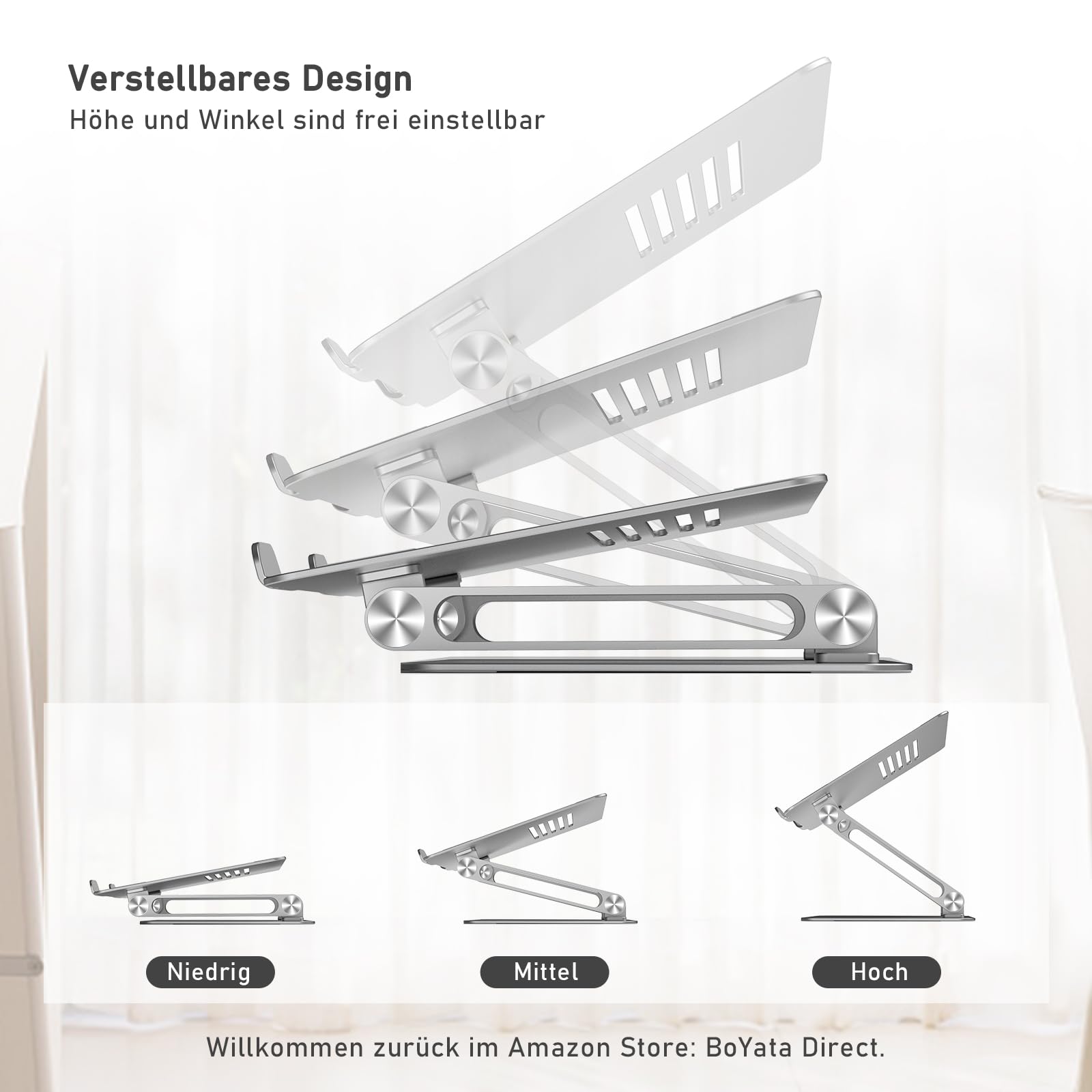 Boyata laptop stand, multi-angle laptop stand with heat-vent, adjustable notebook stand compatible for laptops (10-15 inch) including MacBook Pro/Air, Dell, HP, Samsung (Silver)