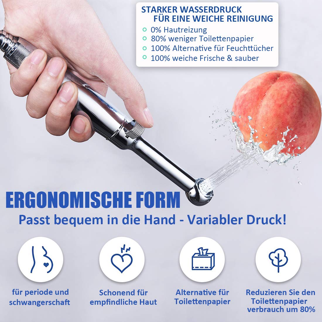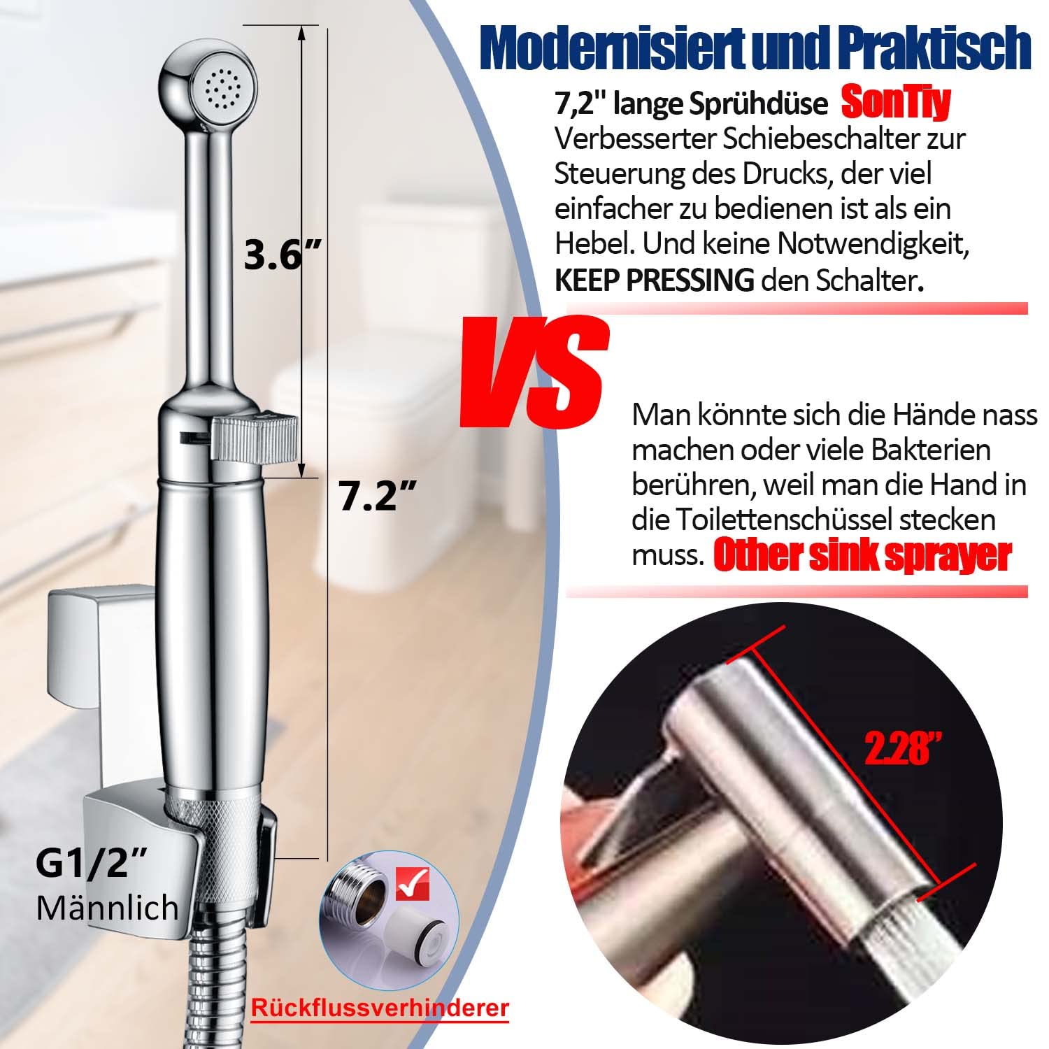["UPGRADE BIDET: Bidet handheld sprayer adjustable features a humanized check valve. The check valve only allows water to flow in one direction to prevent the sprayer from being contaminated by backflow of water. Keep your sprayer clean and hygienic for a long time!","PREMIUM QUALITY & 100% LEAK-PROOF: The bidet handheld sprayer is made of high-quality brass materials and coated with an anti-rust layer. So there is no need to worry about scratches and rust. The SonTiy bidet handheld sprayer is made of high-quality materials that have been optimized for durability and leak-proofing in long-term tests with over 500,000 uses","ADJUSTABLE PRESSURE: The bidet sprayer does not require constant pressure on the trigger. Once in the right position, the bidet sprayer always has the right pressure. This allows hands to be free to focus on cleaning. It can be adjusted to low pressure for use on babies and pets, and high pressure for toilet cleaning","SUSTAINABLE: The bidet set with handheld sprayer is environmentally friendly. Production of toilet paper harms the planet and also affects the household budget. On average, each German consumes more than 3,500 rolls of toilet paper in their lifetime, which can easily be saved by using the SonTiy bidet handheld sprayer. This reduces the burden on our domestic forests and wastewater systems","VERSATILE: The uses of the handheld sprayer are almost endless. The bidet spray attachment can be used as a handheld sprayer for thorough intimate cleansing or for cleaning dogs, cats, and other pets. Additionally, with the SonTiy bidet handheld sprayer, it is possible to remove dirt from diapers or clean baby clothes. It can also be used to gently wash hair and clean the bathroom floor"]