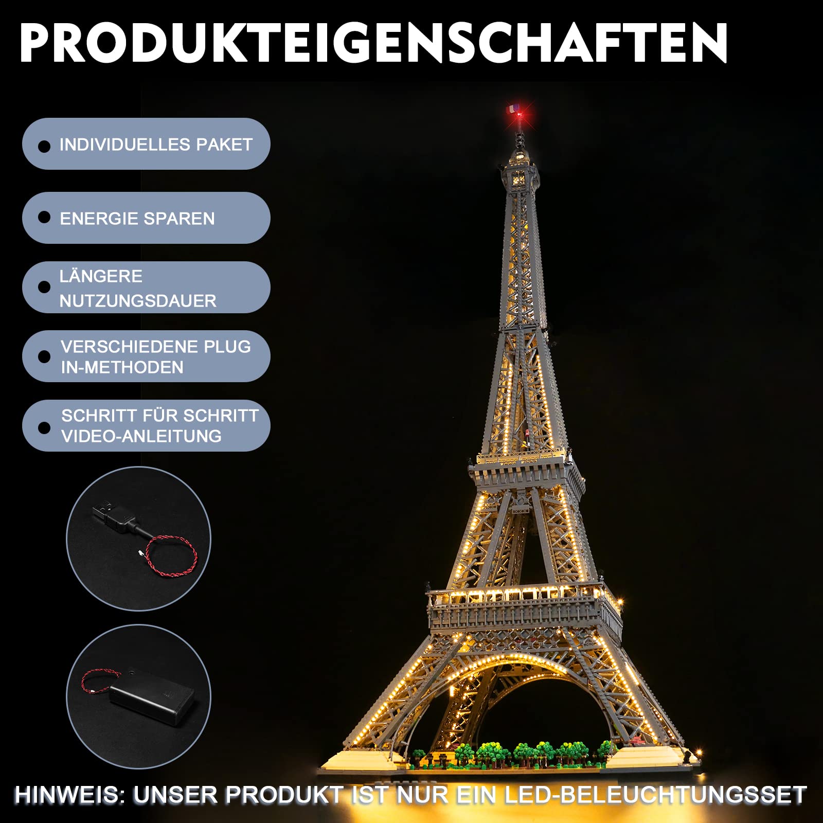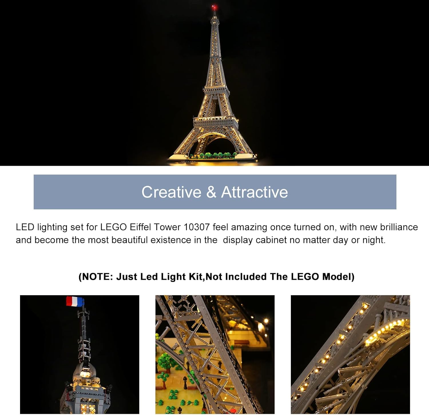 ["【Easy to install】 Specifically compatible with LEGO The Eiffel Tower Building Set. All LEDs have a uniform light pattern and the cable plugs fit well together. Step-by-step video installation guides are provided by our professional Light-Build team to assist you with the installation.","【Safety with experience】 Our decoration light kit is made of high-quality copper wires, equipped with heat and burn protection, and can extend their operating time for you. 5V low voltage brings you a safer experience.","【Enjoy creative DIY fun】 Our LED light kit for the Eiffel Tower provides bright lighting for you to relax from your busy life and regain your beautiful night. The lighting set is perfect for model lovers to personally upgrade your blocks and make your models more advanced while enjoying the fun of DIY.","【Ideal gifts and charming display】 These lights from Architecture The Eiffel Tower would be a great birthday gift, Christmas, New Year, Children's Day, graduation, Thanksgiving, Valentine's Day gift for any model building enthusiast. It can illuminate your bricks brightly in the dark and turn models into a charming display area, storage shelf, or table.","【Multiple power supply options】 The package comes with a USB cable. The LED lights for 10307 can be powered by power bank/wall charger/USB outlet/laptop/other USB port device."]