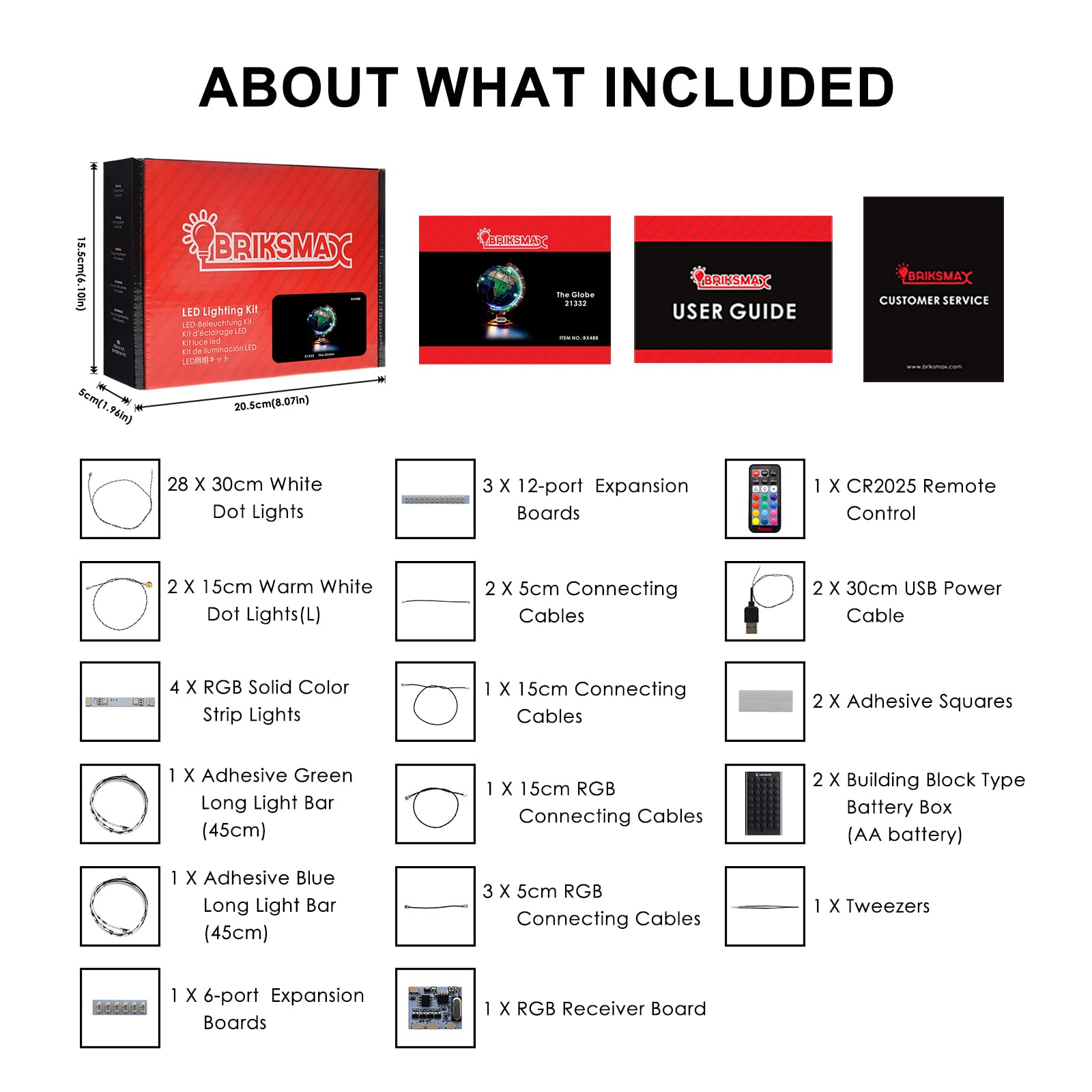 ["Innovative design: Designed for 21332. With this lighting set, you can transform your globe from dark to bright, bringing it to life.","Brilliant craftsmanship: Using safe and reliable materials, with various lights and hidden lines to perfect the model display effect. Great for model collectors looking to add more details to their sets.","Easy to install: With a step-by-step guide, you'll find an easier way to enjoy the pleasant DIY process and make a huge upgrade to your favorite building kit.","Warm service: We always do our best to provide our customers with high-quality products and excellent service. If you have any issues with your product, please email us. We will help you solve the problem in a timely manner.","Note: LED lights only included. All LEGO sets shown in pictures and videos are not included."]