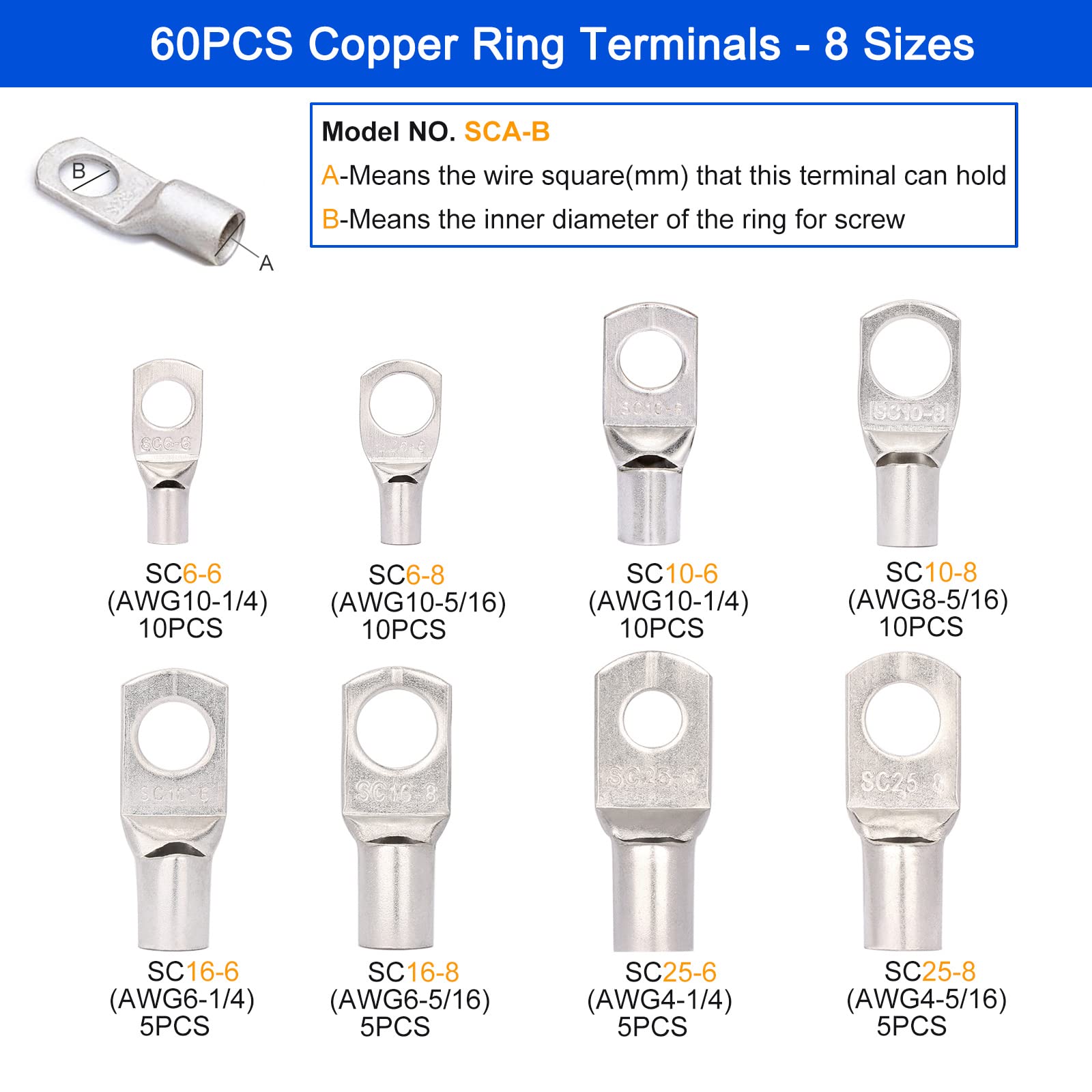 "Package Contents: User Manual, 1 x Large Crimping Tool, 8 sizes 60PCS Copper Ring Cable Lugs suitable for most applications"