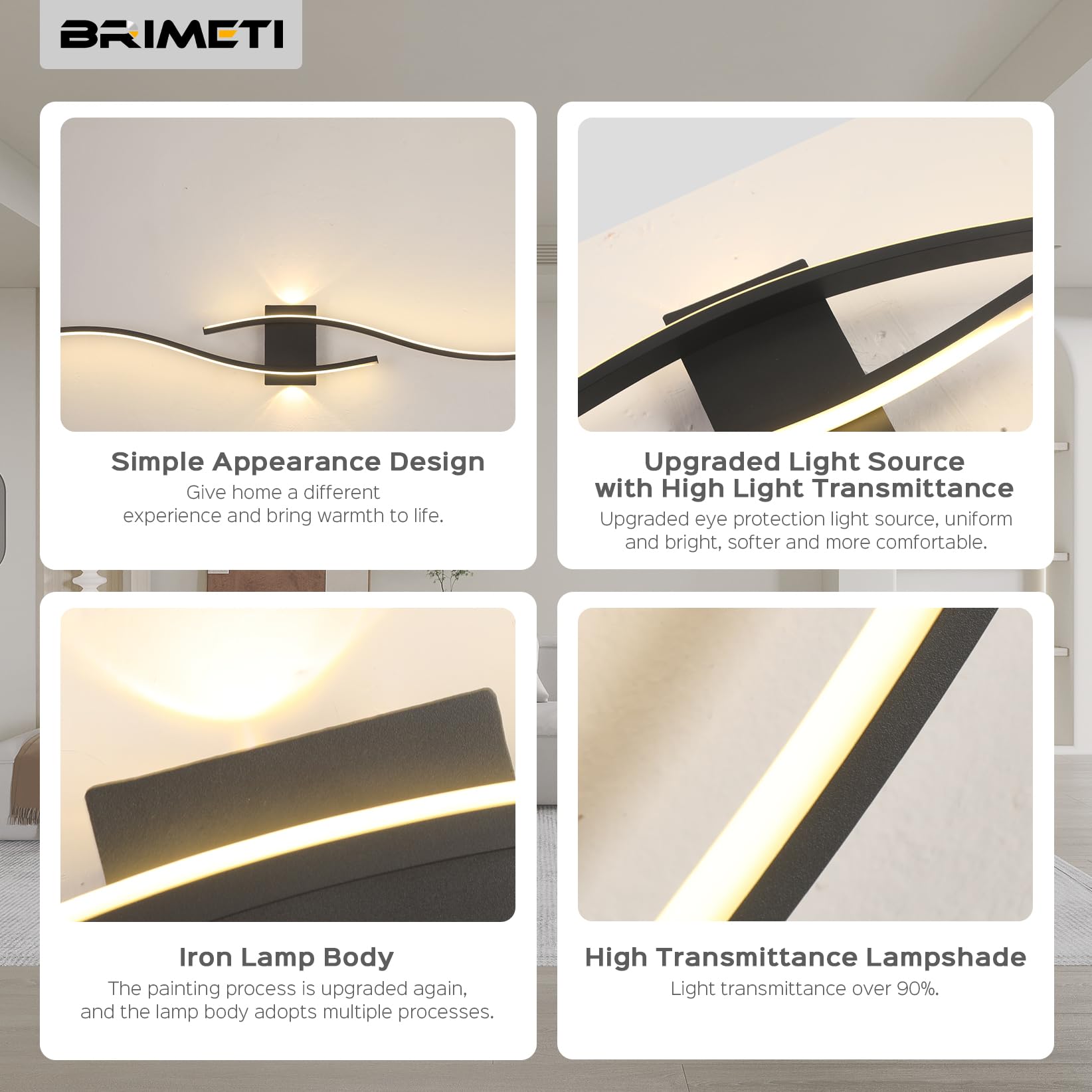["š”ćBeautiful AppearancećBRIMETI 21W long LED wall light for indoor use: creative wave design up and down, exquisite workmanship, sleek light body, perfect interpretation of fashion taste, easy to combine with different decorating styles.","š”ćEnergy SavingćInput voltage of the black indoor wall light: AC 230V, color temperature: Warm White 2700K / Natural White 4000K / Cold White 6000K, using high-quality bright COB LED chips, soft light effect, low energy consumption, no flicker, eye protection, brightness: 1500 lumens. Length: 100cm.","š”ćSafe to UsećThis modern black indoor wall light is made of thickened aluminum material, high quality, not easy to rust, antioxidant, environmentally friendly, safe for health and free of chemicals. CE certification, short circuit protection design, IC constant current power supply, absolute current safety and a lifespan of up to 30,000 hours.","š”ćEasy Matching Styleć-It is an ideal bedroom long indoor wall light as a reading light, also suitable for your living room, office, dresser or bathroom, hallway, corridor, closet and other dark areas. You can adjust different shapes as desired, even without lighting, it is a work of art.","š”ćIncluded in the PackagećA 100cm long indoor wall light and a set of installation accessories. BRIMETI always stands behind its products. No matter what problem with the product, do not hesitate to contact us, we will solve it as soon as possible."]