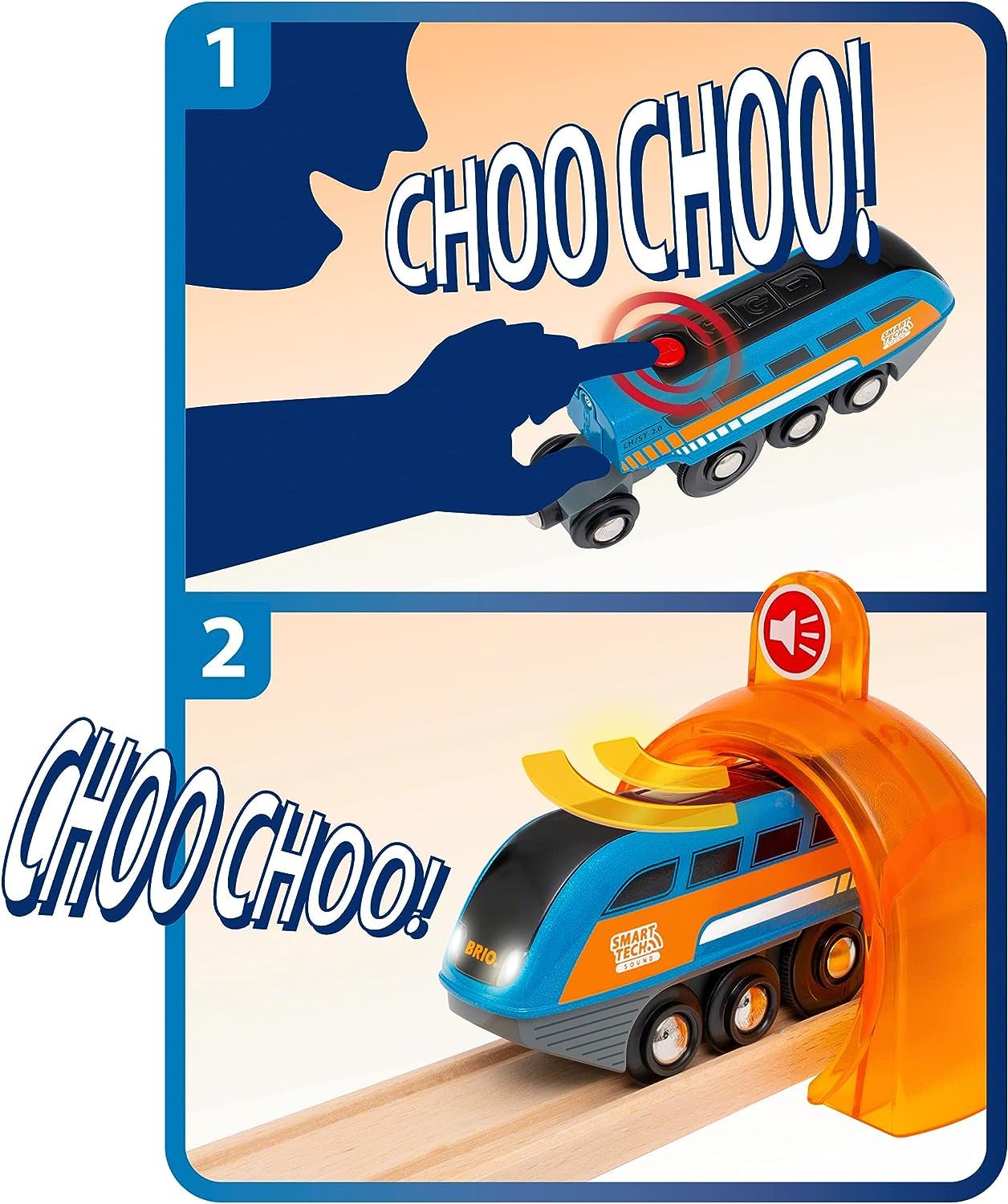 "The battery-operated train responds to the Smart Tech Sound Railway Workshop, the Action Tunnels, and the Mountain Tunnel with exciting light, sound, and motion actions: Children playfully learn the principle of cause and effect",