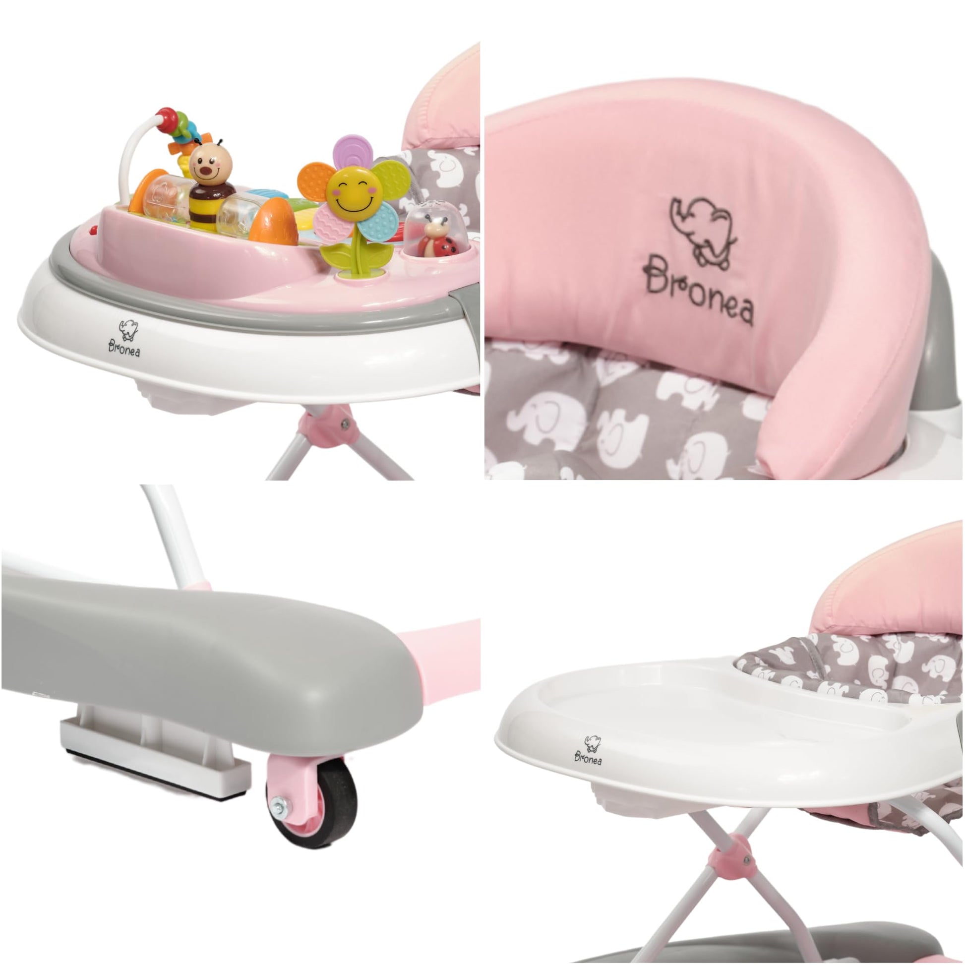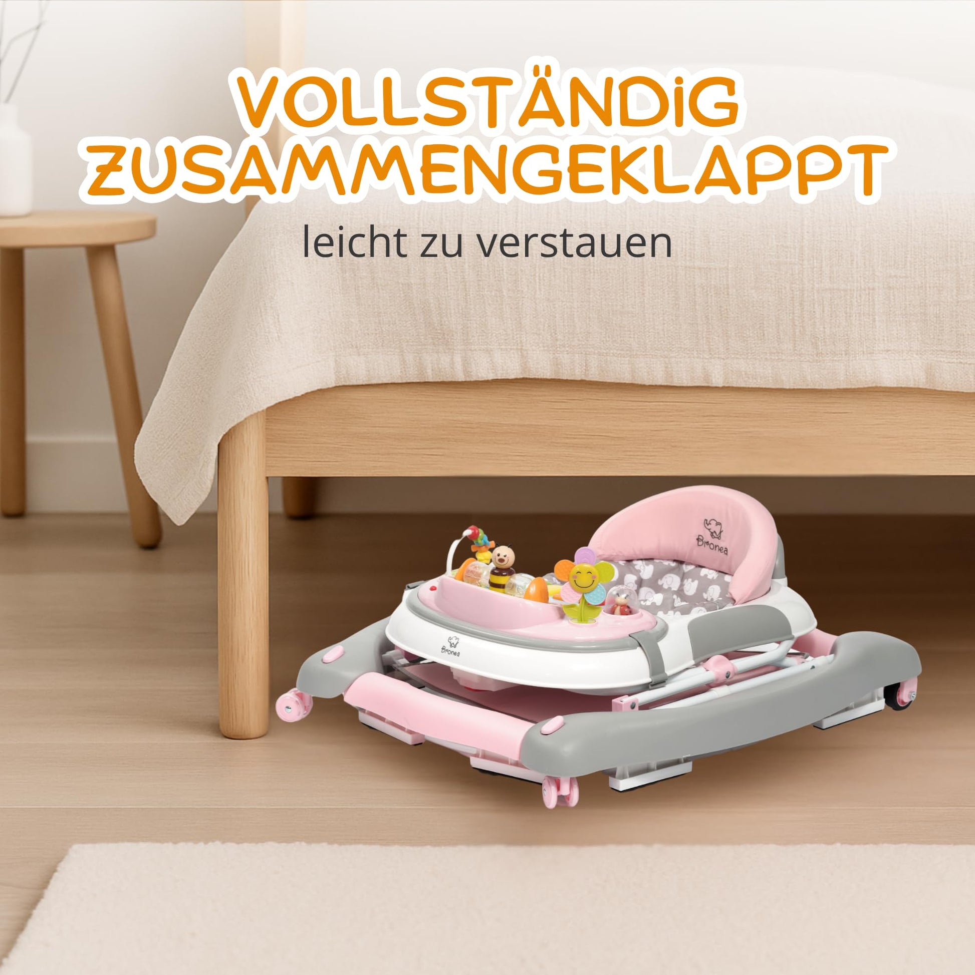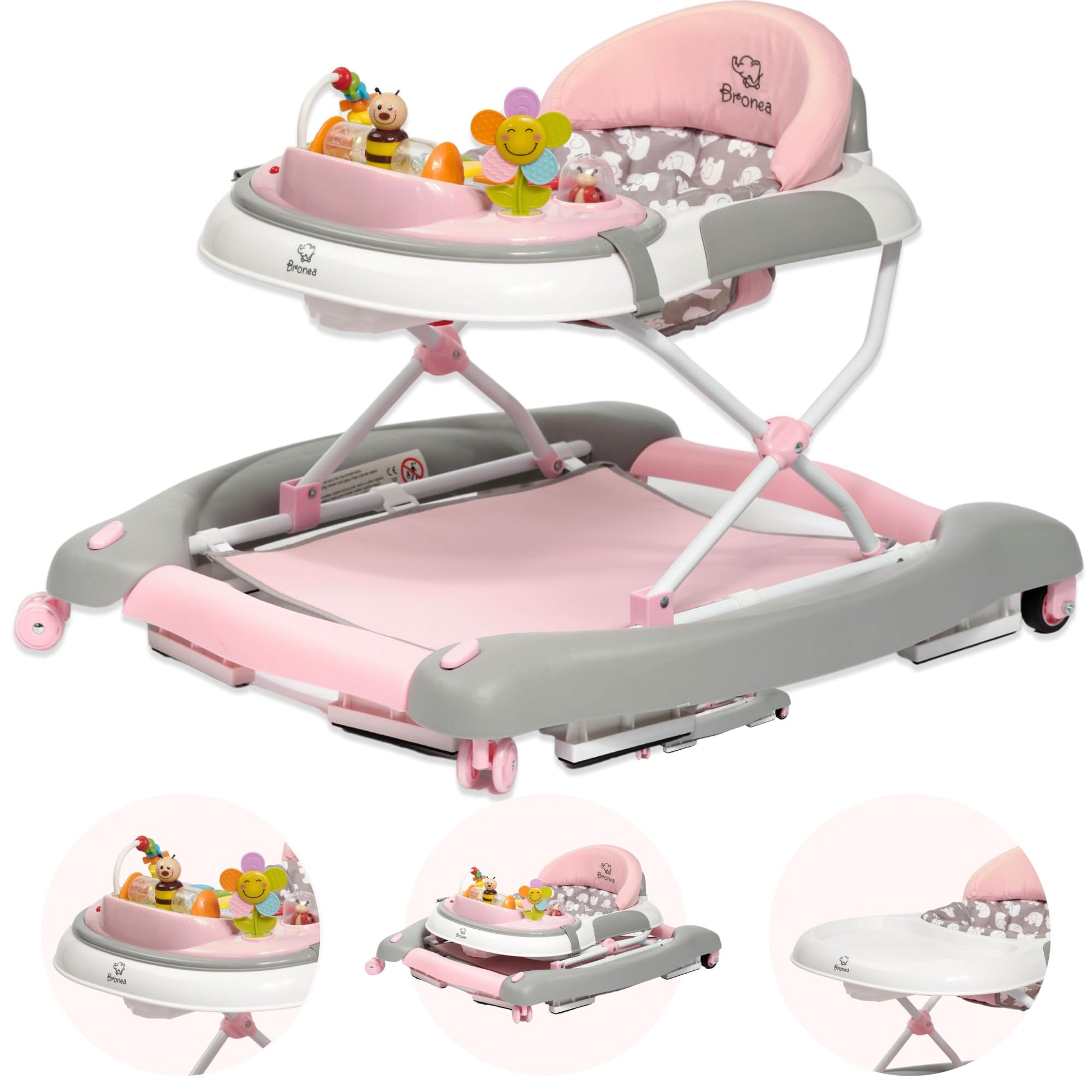 BRONEA® 4-in-1 Baby Walker for ages 6 months and up | Walker with rocking function and musical play panel | Adjustable height, foldable design | Features quiet wheels and brakes for safety