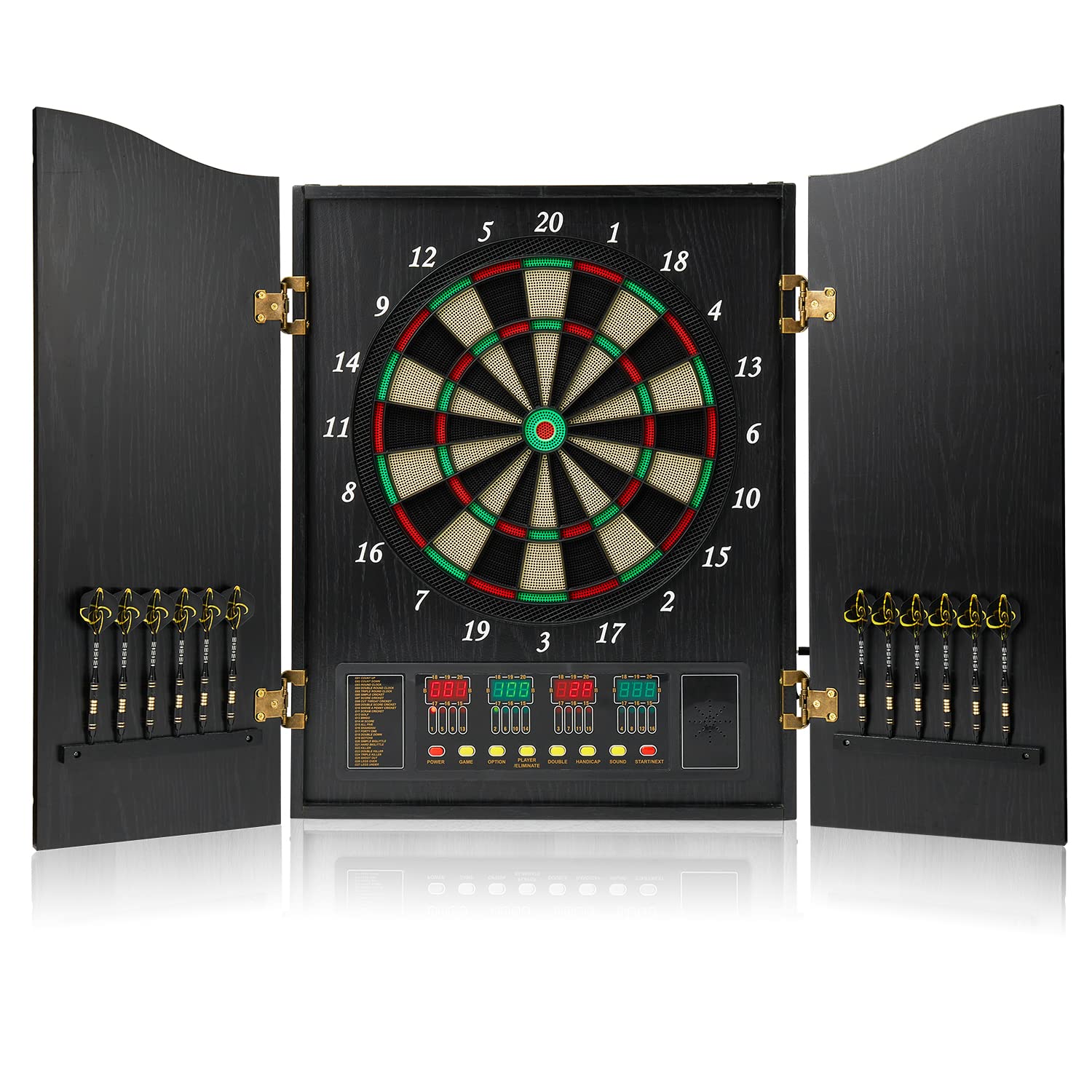 Brovamo dartboard, Decorative dartboard cabinet set [12*soft tip darts], Electronic dartboard, Wooden cabinet doors with integrated scoreboard [black]