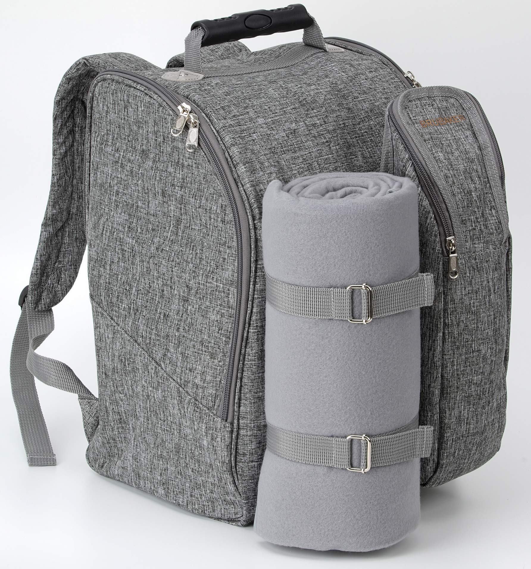 BRUBAKER picnic backpack for 2 people in grey, 28 Γ 40 Γ 22 cm - with cooler compartment, insulated bottle holder, and fleece blanket with waterproof bottom.