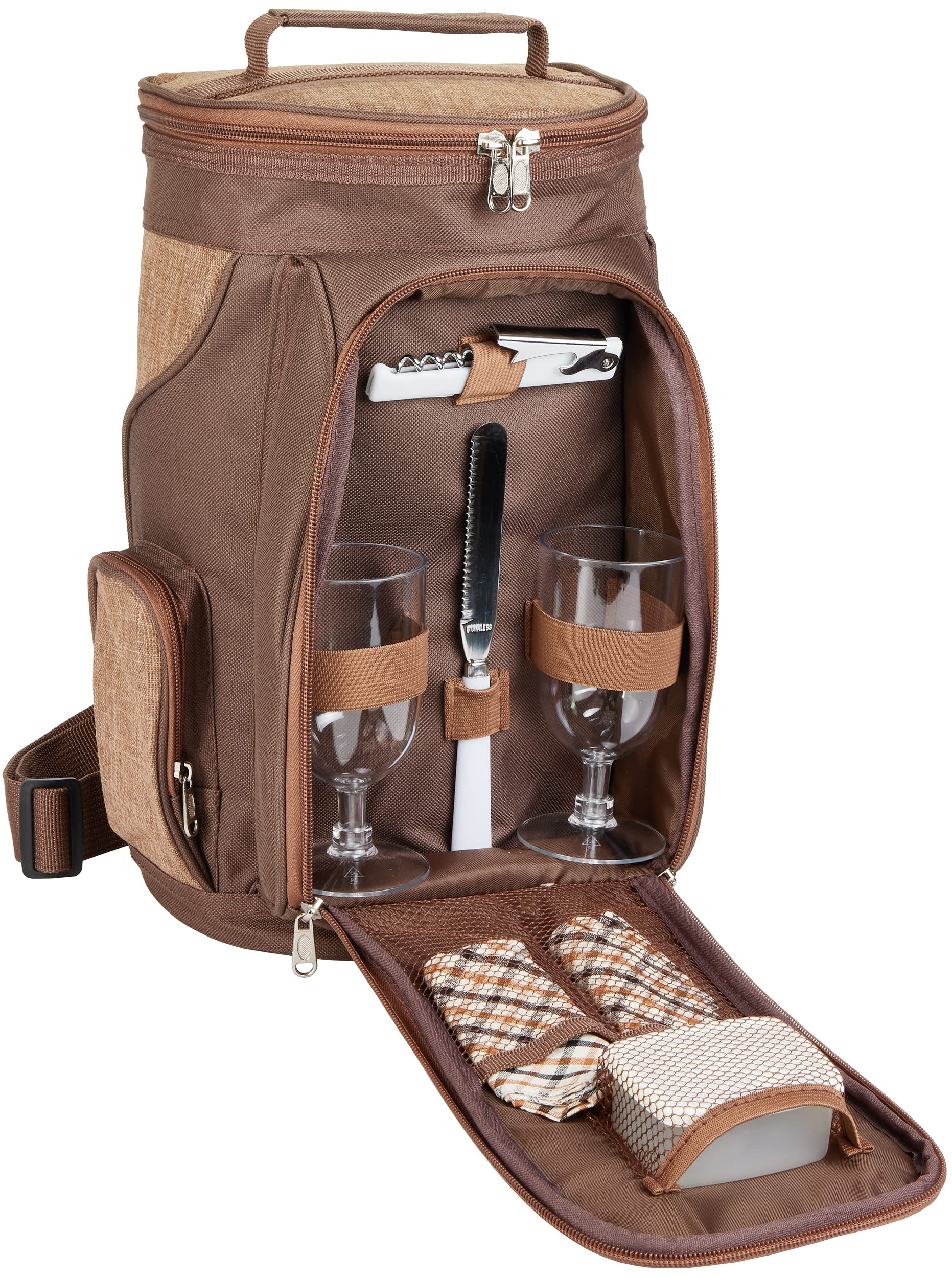 ["π« Champagne picnic for two! Large insulated compartment to carry 2 bottles of wine, champagne or other cold or hot drinks up to 1.5 liters + 1 romantic dinner", "π Organized tableware compartment with 1 bottle opener/corkscrew, 1 snack knife, 2 cotton napkins, 1 plastic cutting board, 1 mini butter box and 2 plastic wine or champagne glasses", "βπΎπ± Wine cooler, picnic bag, lunch bag or simply a cooler - the insulated compartment with 10 liters capacity padded with PE foam and equipped with water-resistant PEVA fabric keeps your wine or food cool and fresh for several hours", "π± Smartphone-friendly - many compartments, smartphone pockets on the right and left, zippered mesh pocket on the back panel for quick access to e.g. area maps - also suitable for Blue Tooth speakers or power banks", "π The perfect gift for wine lovers and picnic enthusiasts, for weddings, engagements, birthdays, Father's Day, Mother's Day, or Christmas; for a romantic picnic for two or a champagne picnic, outdoor parties, festivals, concerts, road trips, and much more"]