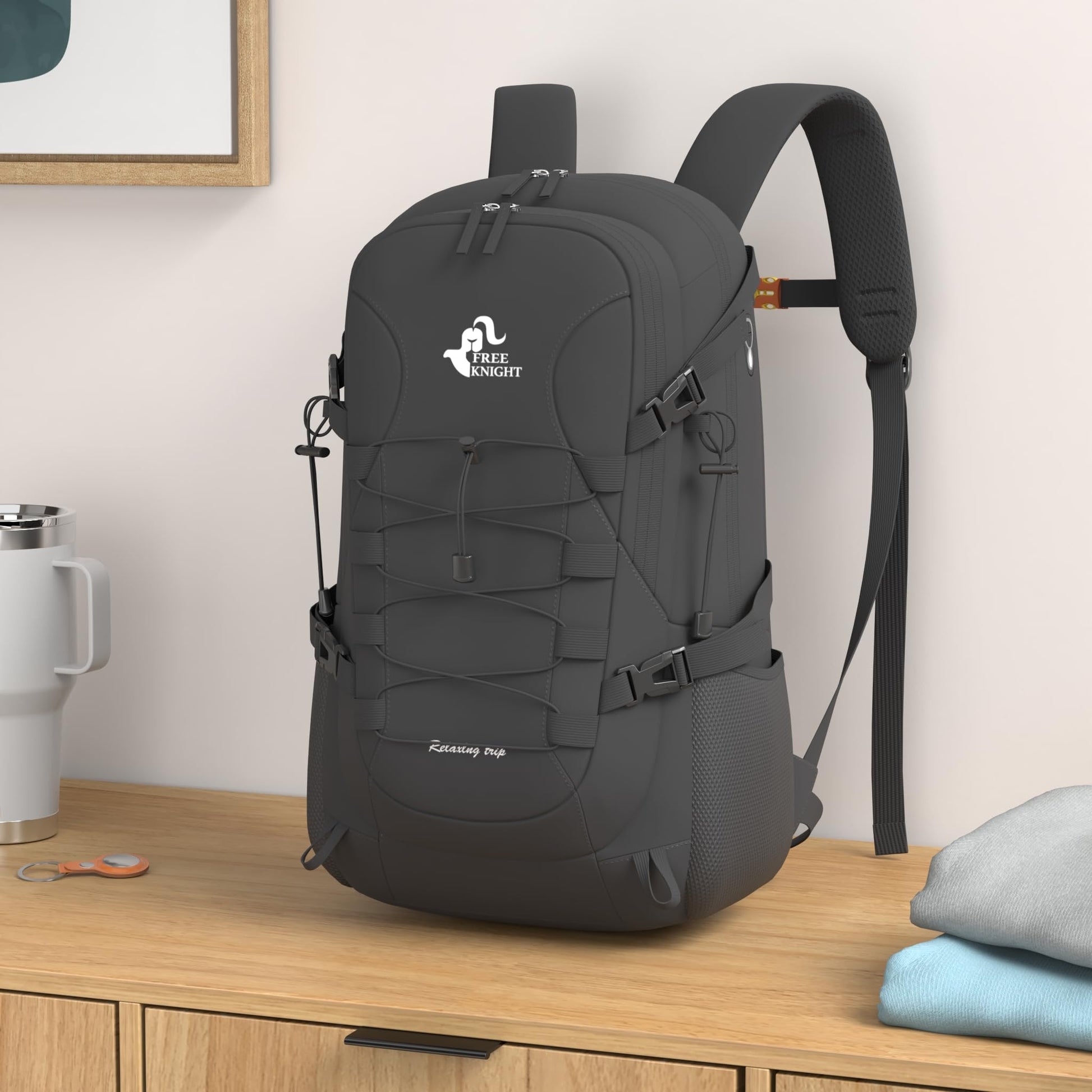 ["Multiple compartments: Spacious main compartments and multiple pockets allow you to store all your gear safely and organized. The main compartment can fit a sleeping bag, clothes, or other everyday items. With an inner pocket for a water bladder. It also has a front zip pocket. The elastic cord is for storing items that need to be easily accessible. Additionally, it has two side pockets for your water bottle or umbrella.","Portable: Perfect for travel, hiking, cycling, camping, and other outdoor activities. Reflective strips on the shoulder straps make it easy to identify at night, making it safe for travel. And it meets the size requirements of most airlines, with enough space for 3 or 4 days of travel.","Waterproof: Made of high-quality and safe material, it is durable for a long time. Nylon material, made of high-quality ripstop polyester material, water-resistant, tear-resistant. Includes an extra rain cover at the bottom, prevents water and dust from getting into the backpack, protects your valuables from heavy rain and keeps everything dry.","Ergonomic design: A breathable sponge is attached to the back to increase comfort. With the ultra-lightweight and wide shoulder straps, breathable mesh shoulder straps to help relieve shoulder strain. Padded and adjustable shoulder straps allow for a customized, comfortable fit, padded mesh back panel for added comfort.","Capacity: 40 l, Size: 23 x 10 x 6 inches, Weight: 1.3 lbs"]