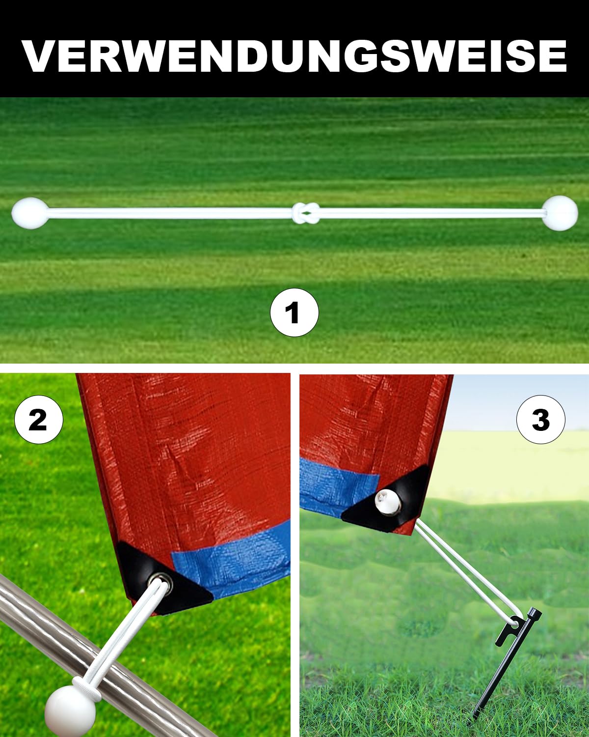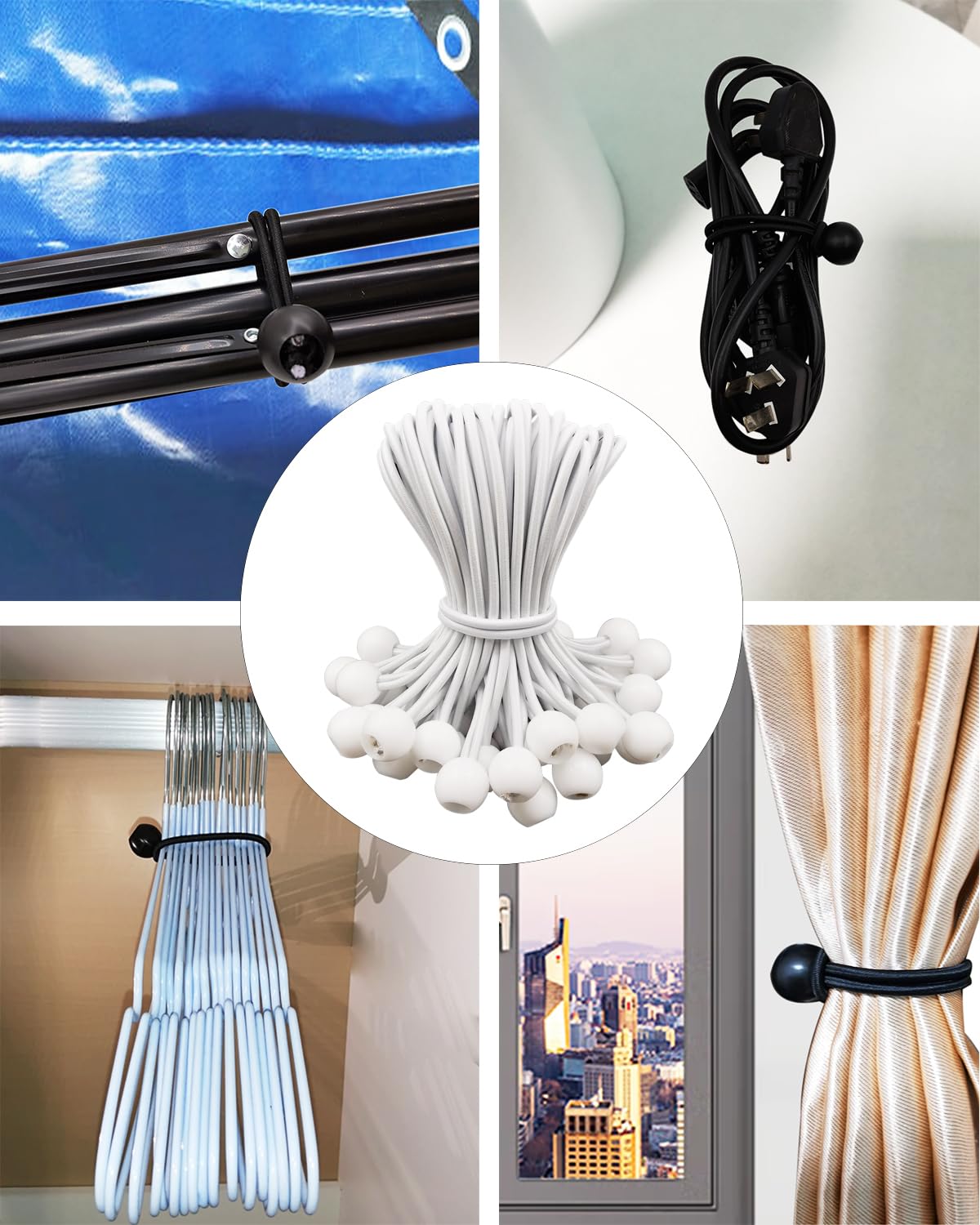 ["MATERIAL: 100 pieces of bungee cords with ball made of high-quality latex and polyester that is elastic, weather resistant, durable, and resilient.","FEATURES: The 15 cm bungee cords with ball can be stretched to 30 cm. And the elastic short bungee cords have a 22 mm plastic ball that fastens well.","OCCASION: Our tent bungee cords with ball are suitable for tarps, camping, boat covers, tents, waterproof tarp, gardens, railings, caravans.","OPERATION: Elastic short bungee cords can be easily pulled through the eyelet and support, then locked on the ball. And you can connect multiple bungee cords with balls to get additional lengths.","TIPS: You can use bungee cords with balls yourself or give it as a gift to your family, friends, lovers, and colleagues."]