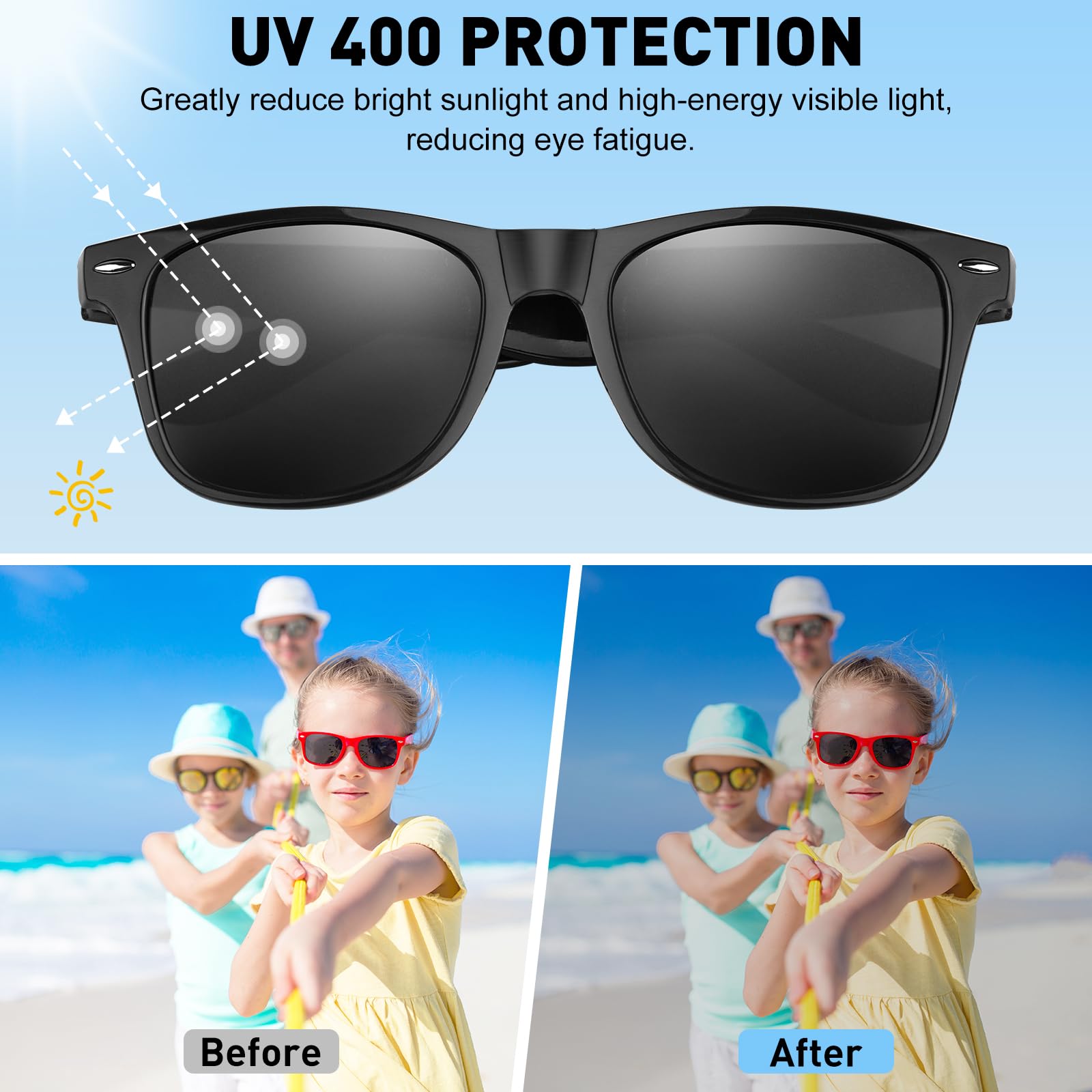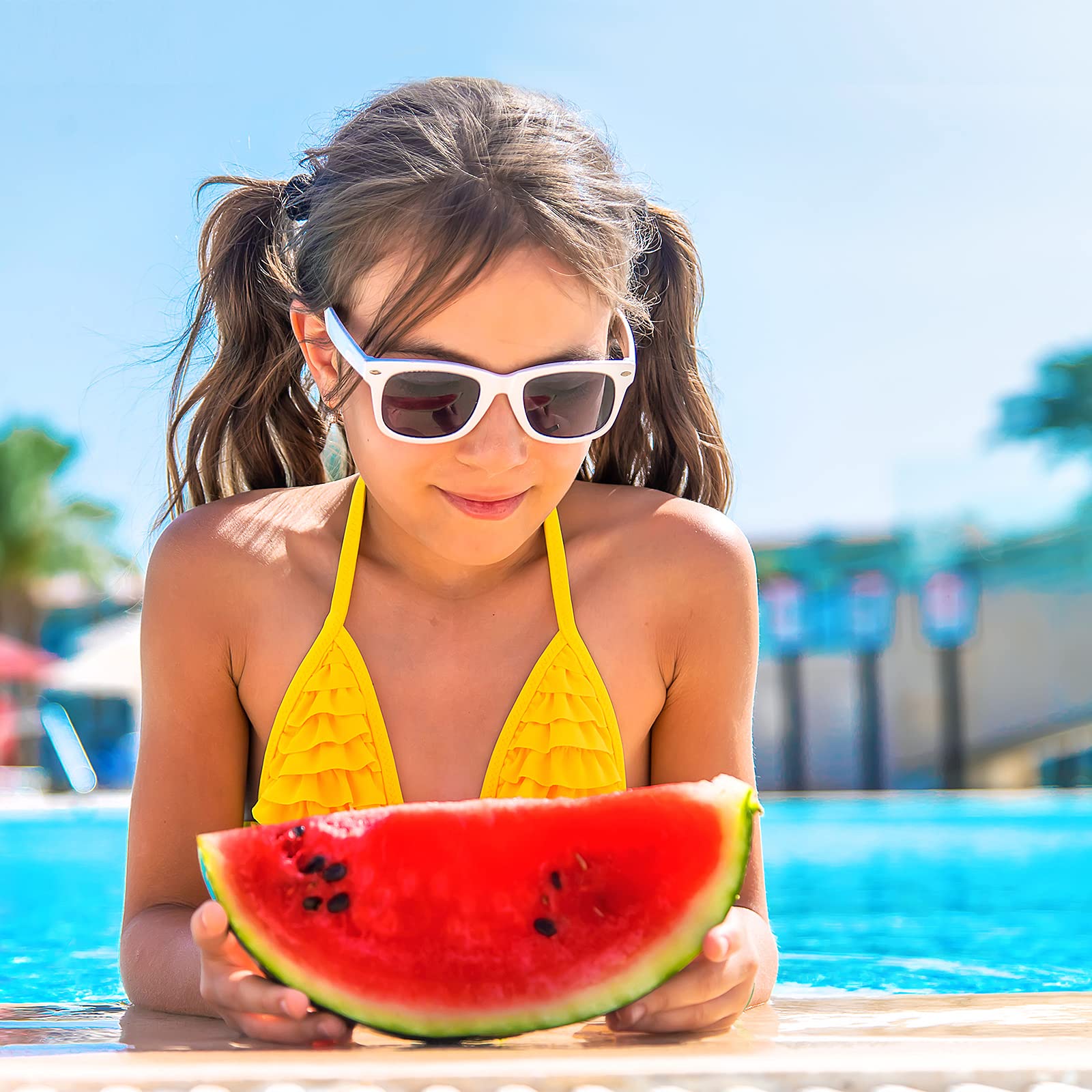 ["Package: 24 packs of kids sunglasses (12 colors, 2 pairs of each color)", "Size: Frame size is approximately 5.12 inches / 130 mm wide, glasses leg length 5.12 inches / 130 mm", "Good quality: Made of comfortable and durable polypropylene material with UV400 shatterproof polarized lenses that greatly reduce bright sunlight and high-energy visible light, and brighten eye fatigue", "Wide Range of Scenarios: Summer parties, beach parties, raves, school dances, and birthday parties as sweet gifts, these sunglasses can also be a treat", "Note: These sunglasses are suitable for children, but too small for adults. If you have any questions, feel free to contact us"]
