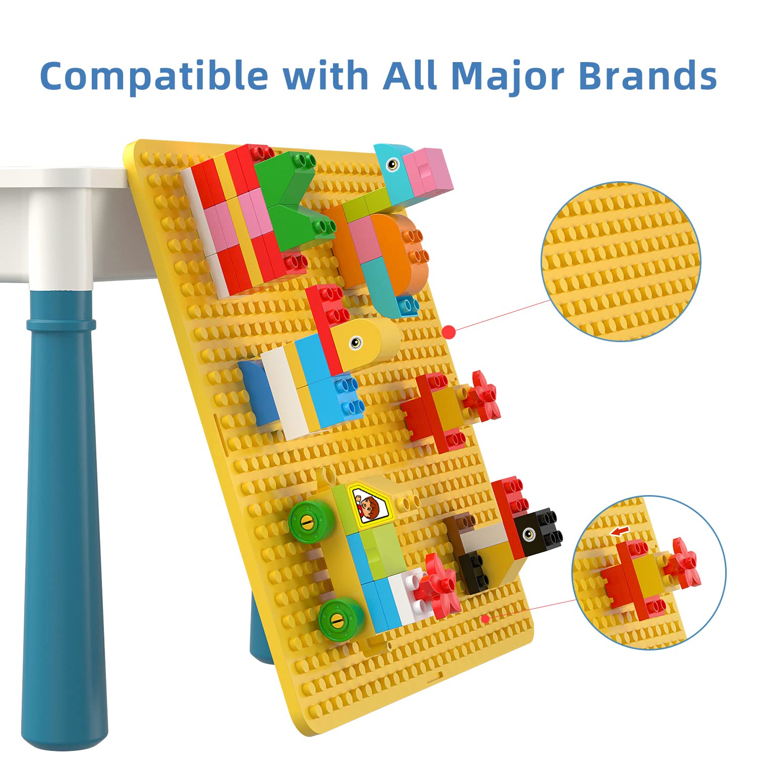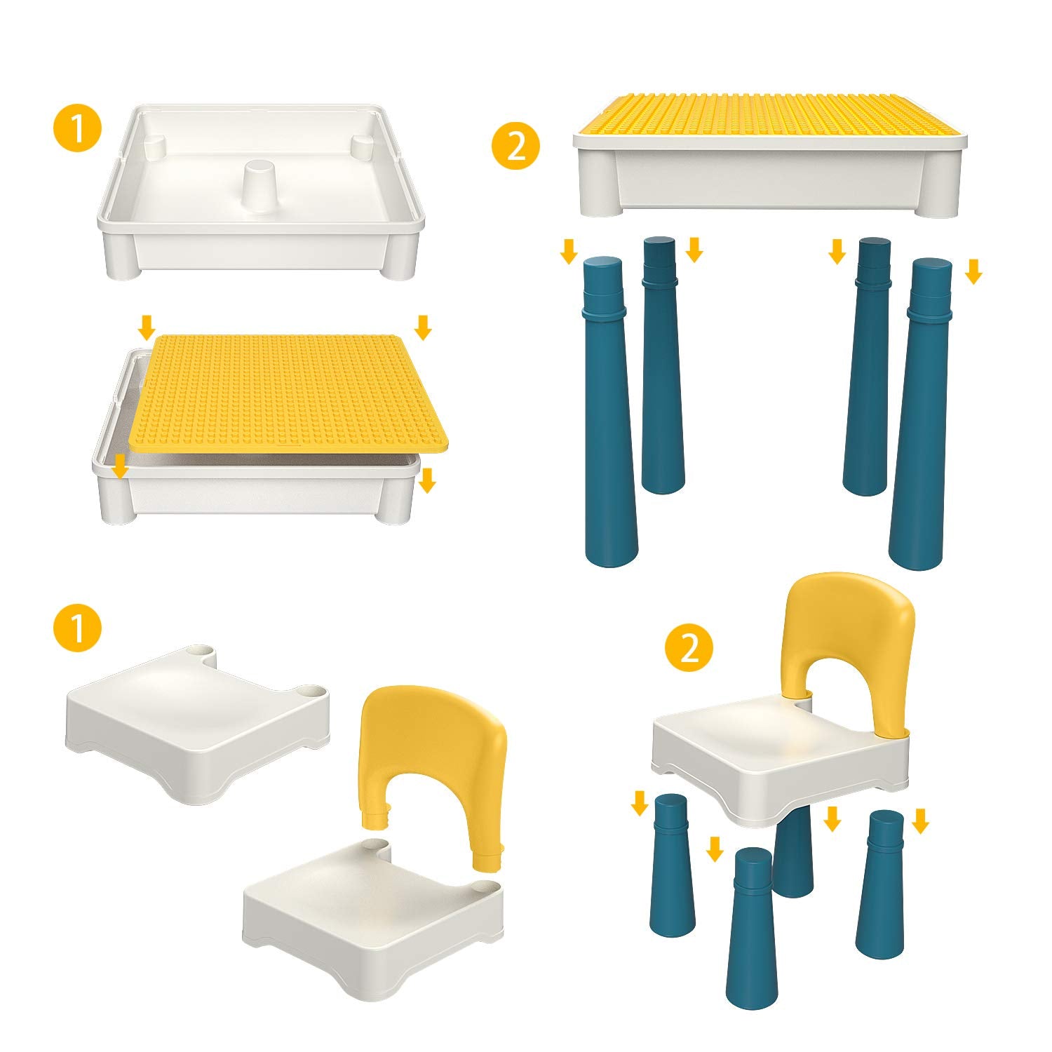 ["5 IN 1 ACTIVITY TABLE WITH CHAIR FOR KIDS: The double-sided tabletop can be used as a building block table, craft table, water and sand play table, reading and learning table, toy storage table, and traditional table.","WELL DESIGNED JUST FOR KIDS: Featuring a triangular design and non-slip pads on each leg of the table and chair to reduce tipping and increase safety. The chair's backrest is ergonomically designed to ensure your child sits in the correct posture and feels comfortable.","130 PIECES OF LARGE BUILDING BLOCKS: Our bricks are large and pose no choking hazard. Children can easily mix and match with their collection, as all the bricks are compatible with most major brands.","KID-SIZED CONSTRUCTION SET: This table and chair set for kids is just the right size for your little ones! Assembled table dimensions: 45 x 45 x 43 cm (17.72" L x 17.72" W x 17" H), chair dimensions: 26 x 25.5 x 43 cm (10.3" W x 10" D x 17" H). Seat height of the chair: 23.6 cm (9.3"), safety tested for strength and stability. Table can hold approximately 50 kg, chair must weigh 100 kg.","BEST KIDS GIFTS: This activity table is a perfect present for any occasion for girls and boys, preschool-age kids, grandchildren, and nephews. Our toy set ensures all are made from high-quality plastic and tested to comply with all toy safety standards, making them safe and reliable for kids."]