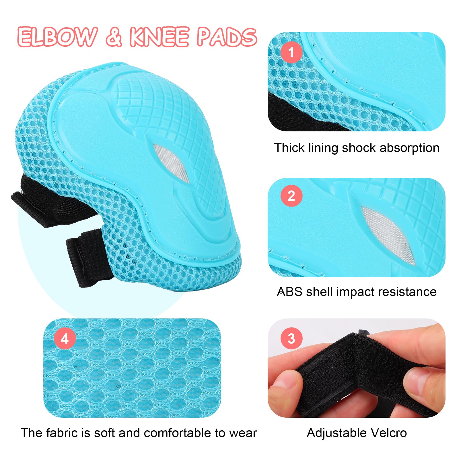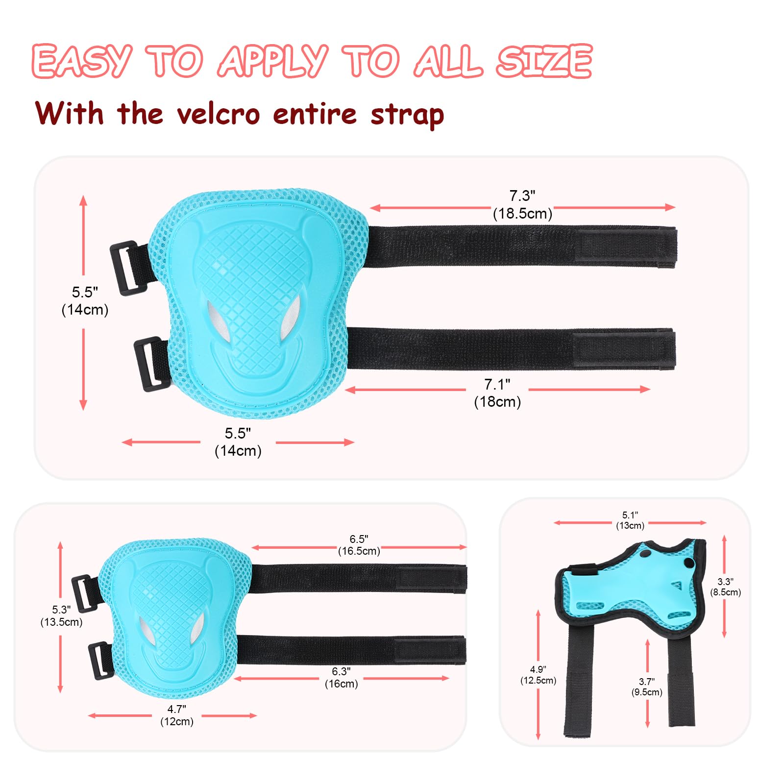 "6-in-1 Knee Pad Set: The children's knee pad set is specially designed for young adventurers in sports and is perfect for children aged 3 to 14. The set includes 2 knee pads, 2 elbow pads, and 2 wrist guards to provide comprehensive protection for your children.