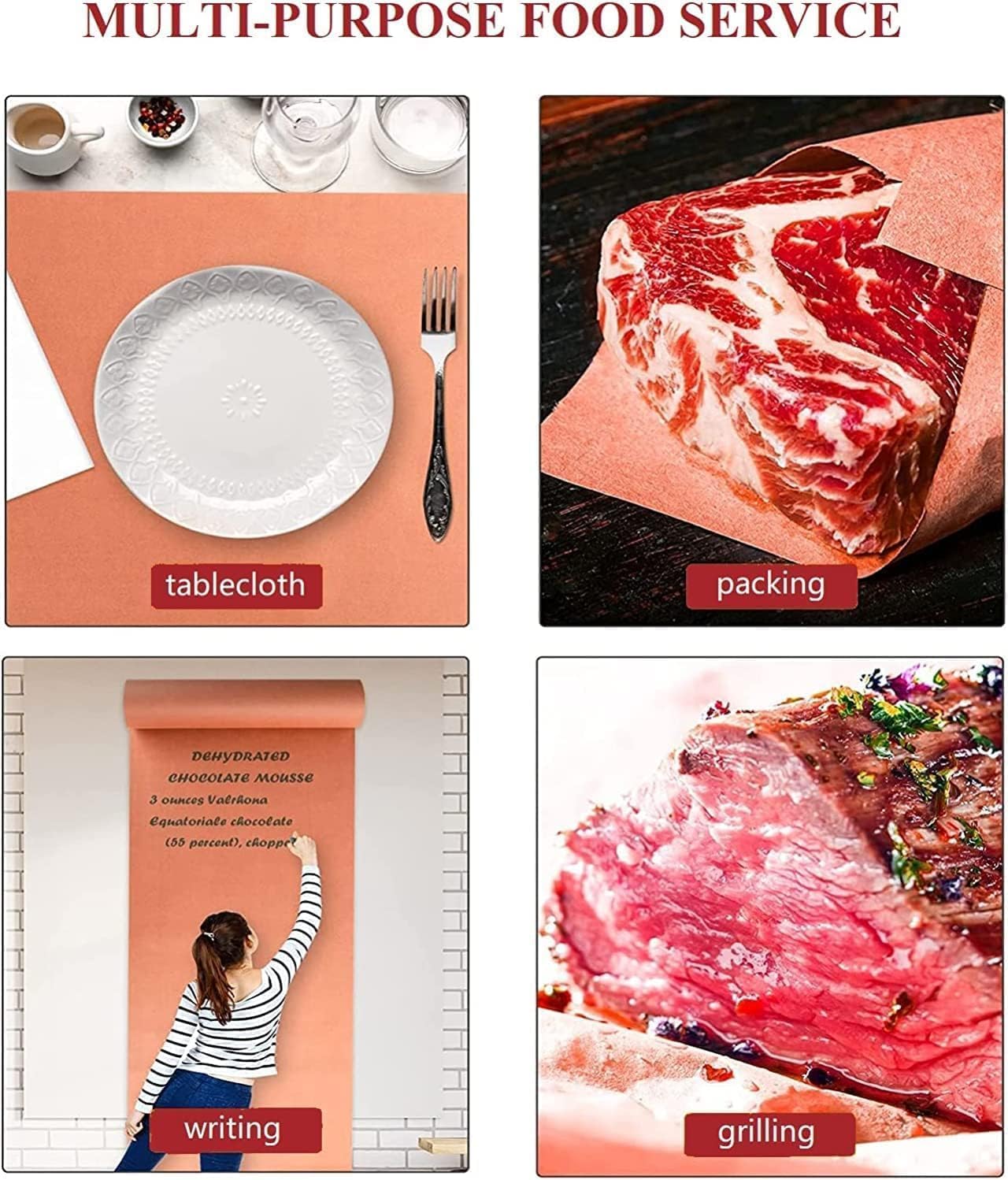 ["【PERFECT SIZE】12in*100ft,handy size butcher paper roll for your choice. Approved for direct food contact, our pink butcher paper holds juices in while still letting steam escape, making it the perfect choice for smoking meats.","【STRONG & DURABLE】 No more wimpy paper! Our high-grade butcher paper fibers provide superior strength that won't fall apart when soaked in oil or food juices, making it ideal for Texas Style BBQ.","【 UNCOATED & UNBLEACHED】 No bleach, no wax, no coatings. This means there are no harmful or toxic polymers or chemicals that can leach into your food while cooking. Use this paper for your next backyard grilling party!","【TENDER MEAT】 Say goodbye to tough meat! Wrap your brisket, steaks, ribs, and more while smoking in our pink butcher paper to help meats reach their optimum temps faster, remain juicy, and get that deliciously smoky and crunchy, Texas crutch-style bark.","【MULTI-PURPOSE】 This paper is perfect for all your backyard grilling, serving, or craft needs. Use this paper for smoking meat, crawfish boil, serving burgers and fries, ribs, table runner, packing paper, wrapping gifts, placemats, and more!"]