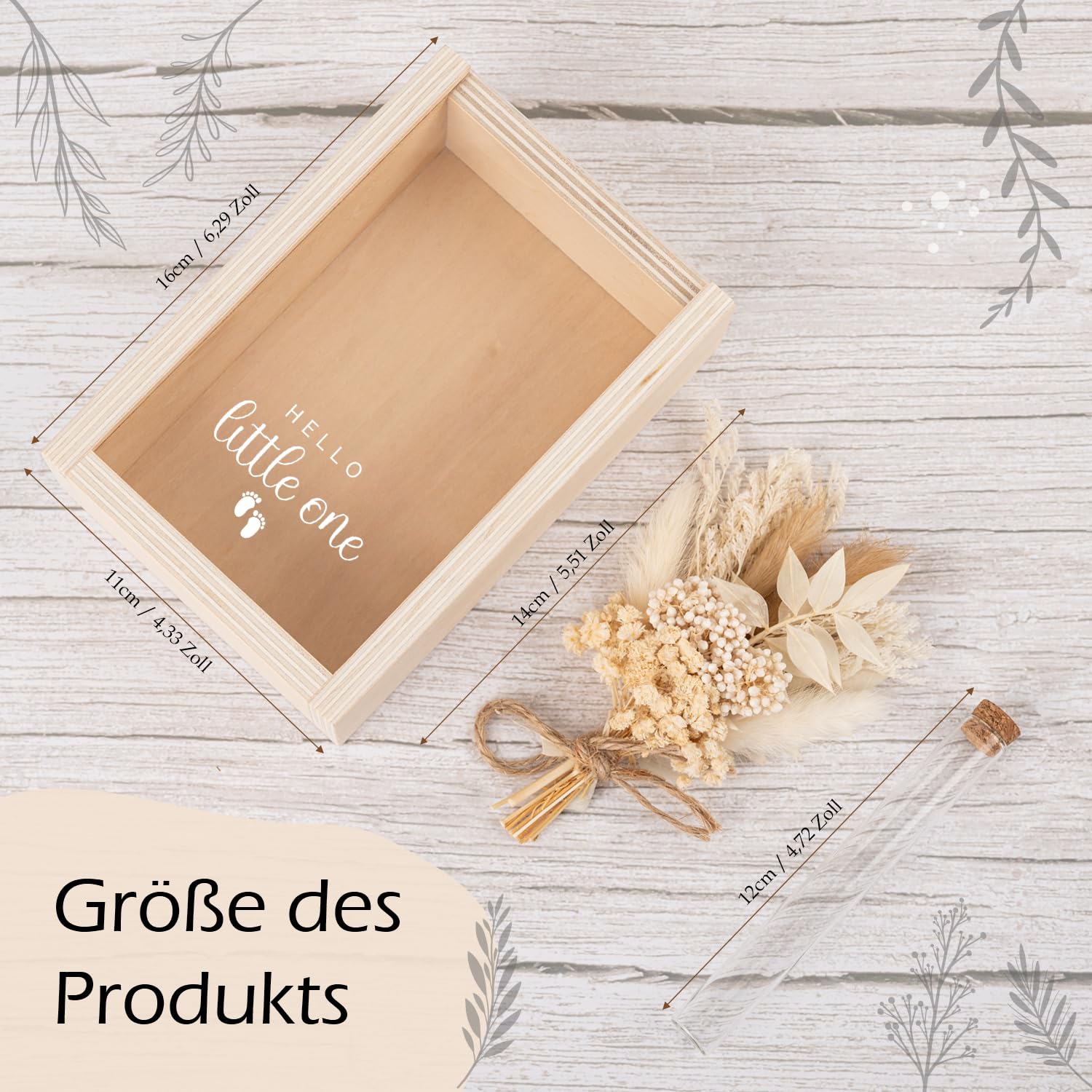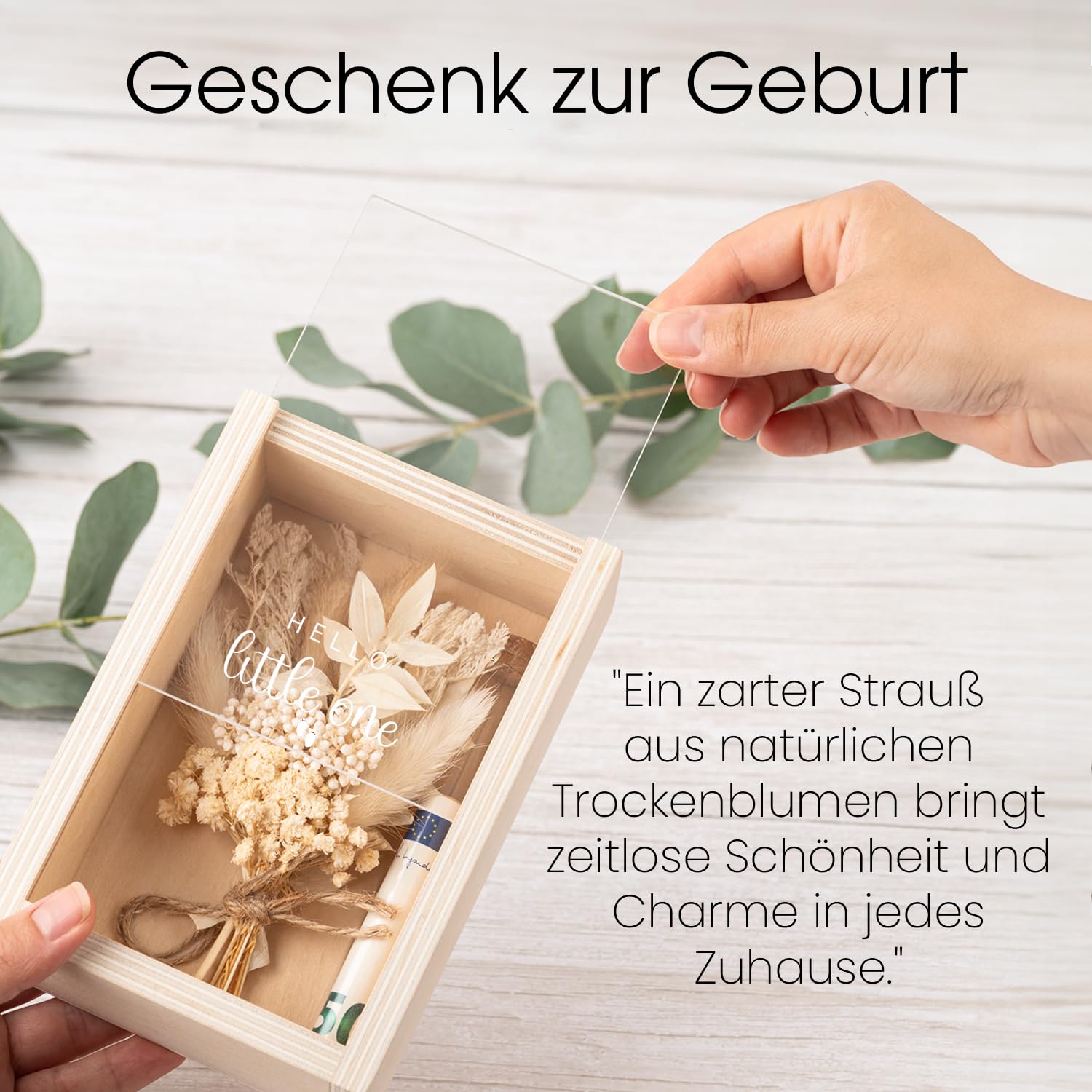 ["π Elegant design: A charming wooden box with a transparent window and the engraving \"Hello little one\", which is a highlight on any gift table. π Dried flower bouquet: A beautiful bouquet of handpicked dried flowers that adds a romantic touch to the gift and lasts a long time. π΅ Practical test tube: A delicate test tube, ideal for storing banknotes, securely and stylishly placed in the wooden box. π Versatile gift idea: Perfect gift for birth, but also suitable for other special occasions.","πΏ Made of high-quality wood, the box is not only aesthetically pleasing, but also durable and environmentally friendly.","πΉThe test tube in the box provides an original place for banknotes.","πΈThe box is lovingly decorated with dried flowers, adding a personal touch to each gift.","β¨ The combination of wood, dried flowers, and glass gives the box a luxurious feel and makes it a real highlight."]