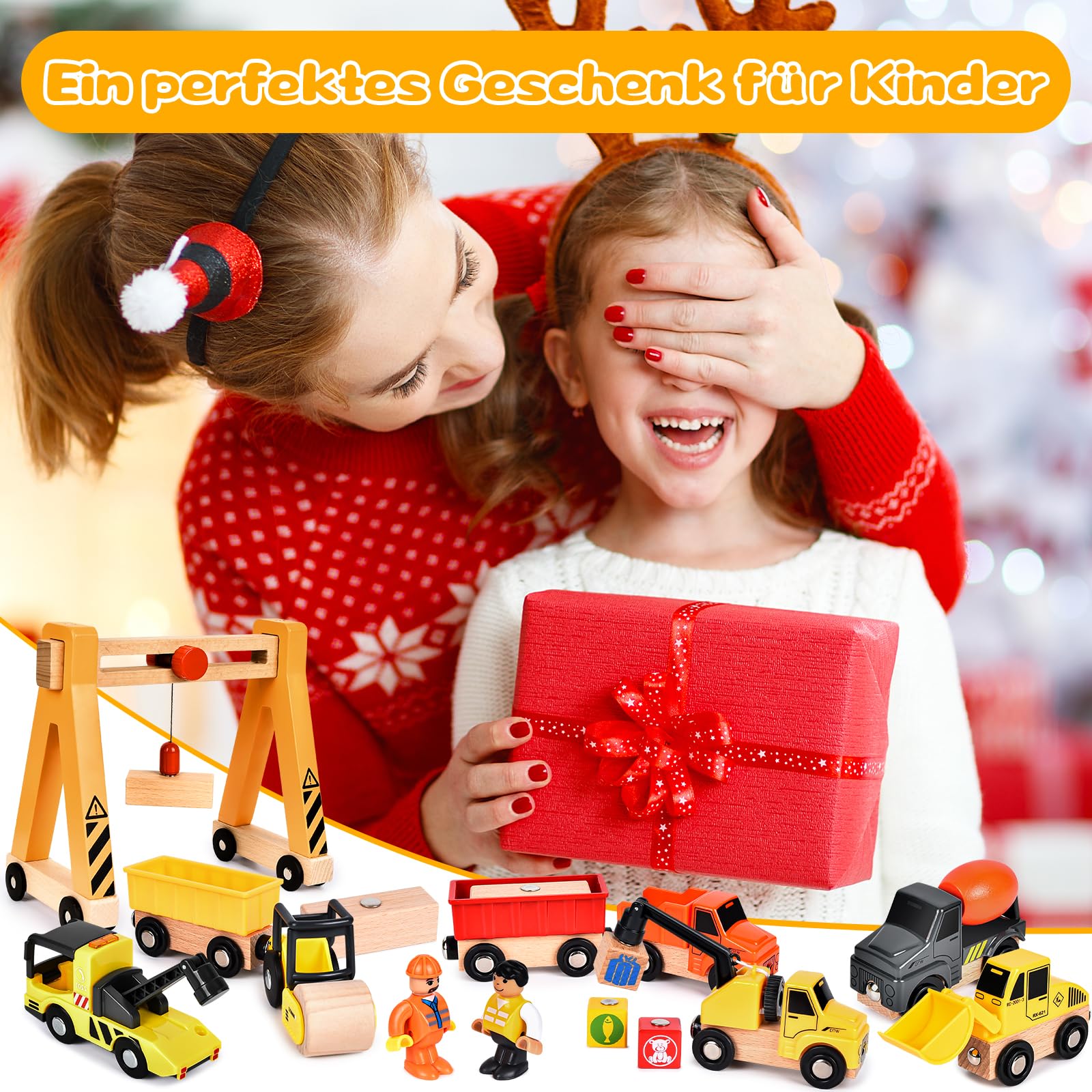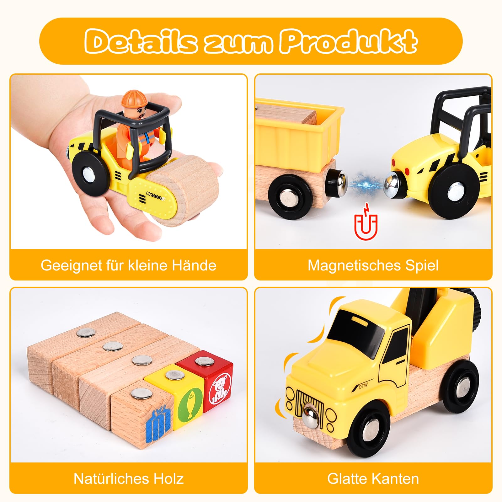 ["🏆Wooden Construction Toy Set: This wooden construction vehicles children's toy set includes a portal crane, 6 magnetic wooden cars (tow truck, excavator, dumper truck, steamroller, crane, mixer truck), 2 Magnetic loading wagons, 2 construction workers, and 6 wooden blocks. Kids can mix and match with a variety of construction accessories and dive into this exciting role-playing game that is sure to be a hit with the little ones!","🧲Magnetic Construction Vehicles Toy: Most toys in this set of wooden construction vehicles for children contain magnetic parts that easily attach to the wagons. The wagons can be assembled with the vehicle through magnetic attraction. The wheels of these construction vehicles not only promote children's interest in architecture and transportation but also stimulate their imagination and creativity.","💡High-Quality Material: Our construction vehicles are made of a combination of sturdy and durable wood and plastic, durable and unbreakable, with rounded edges and no sharp edges. The toy has a long lifespan, allowing kids to play without worries, giving children a taste of a real construction site, Enjoy unlimited challenges and fun!","📚Fun Learning Toy: Kids can create a variety of puzzle scenarios with this wooden construction toy set, stimulating their imagination and creativity. Assembling, adsorption, and carrying trains their fine motor skills and hand-eye coordination, and parents can play with their kids to promote their first understanding of the construction field.","🎁A Great Gift for Kids: This wooden construction toy set comes in a beautiful box, tailored for children aged 2,3,4,5,6,7 years old. It is not only a fantastic choice for little builders but also an ideal gift for any child who has a vision of the world of construction. Also, a great gift for birthdays, Halloween, Christmas, and Children's Day!"]