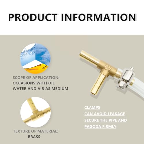 ["Specification: 3 Way 16mm T Hose Barb.","Reliable Quality: Made of high-quality brass, it is not easy to rust and wear, and can be used for a long time.","Wide Adaptation Range: Suitable for connecting pneumatic tools, and the attached clamp can better secure the air tube and ensure better sealing.","Operating Parameters: Please operate under an air pressure below 10 bar, the normal temperature range is -50 to 120 degrees Celsius.","Fast Installation: The threaded connection can be quickly screwed on, and the barbed connection must be inserted into the air tube to be secured, making it convenient for you to connect and use quickly."]