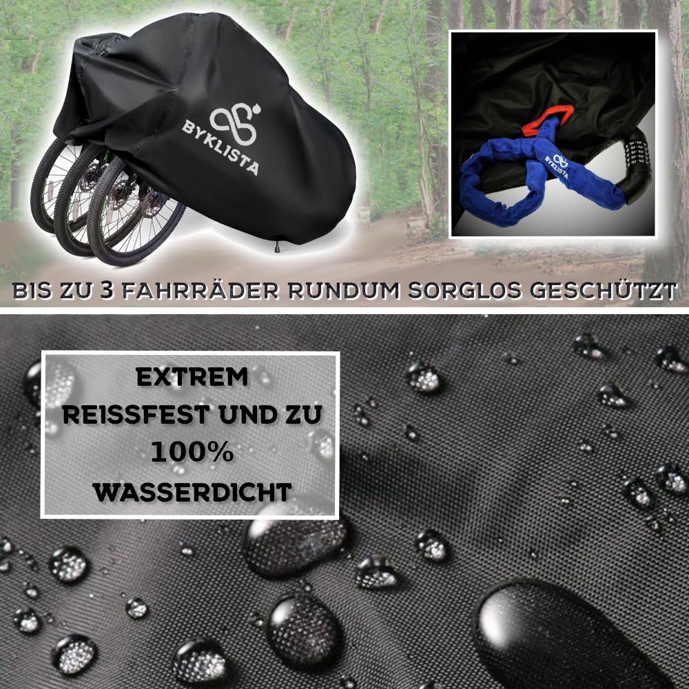 ["✅ TEAR RESISTANT - The bicycle cover for 2 to 3 bikes is made of extremely tear-resistant 210D Oxford fabric. Therefore, a bike cover with a long service life and high UV protection for the bicycle cover.","✅ WINDPROOF - The bicycle garage cover has two extra strong rubber bands at the bottom as well as an extra clip closure to give the bicycle garage outdoor a secure hold in wind & weather.","✅ WEATHERPROOF - This high-quality bicycle garage from BYKLISTA is absolutely weatherproof. The internally welded double seams make the bicycle tarpaulin waterproof. Bicycles winterproof thanks to bicycle cover. Bicycle garage for 2 bikes or up to 3 bikes","✅ CUSTOM FIT - With dimensions: Height 120, Length 210, Width 115 (handlebar), the rain protection bicycle fits up to 3 wheels including 29 inches (bicycles stand close together). Bicycle cover also ideal for racing bikes, mountain bikes & almost all e-bikes. (Please note dimensions)","✅ SAFETY & COMFORT - The bicycle hood as theft protection enables high security with the bicycle cover thanks to the extra lock passage. Bicycle covers waterproof easy to clean and including transport bag."]
