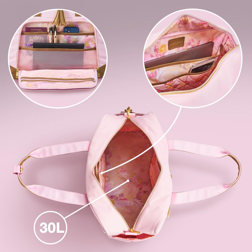["The 45x36x20cm design is perfect for avoiding extra carry-on fees with airlines like EasyJet. Carry it as a shoulder bag, hold it by the top handles, or attach it to your rolling luggage using the back handle.", "The lightweight design is made of 600D PU material and features vegan leather and rose gold details. 17.7 x 14.2 x 7.9 inches, 1.3 lbs.", "30L interior capacity with space for laptop, iPad, and Kindle. Mesh interior pockets for travel accessories and chargers. Easy-access outer pockets for phones, tickets, travel documents, and water bottles.", "3-year Cabin Max manufacturer's warranty"]