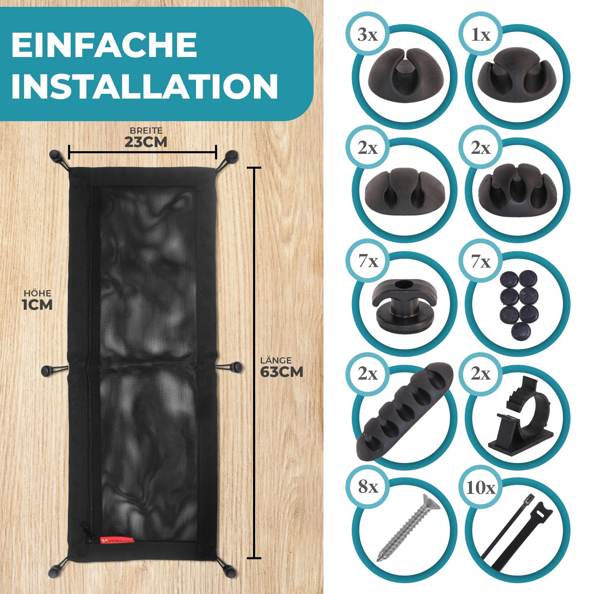 ["SIMPLY HIDE CABLES - With our large cable net, any cables can be hidden under the desk. Easy, efficient, and safe, perfect for any home office or workspace.","MORE DESK ORGANIZATION - Create a clean, tidy work environment. With our cable management net, annoying cables are finally out of sight - ideal for a tidy desk.","WITH CABLE MANAGEMENT SET - Our net cable channel comes with a set of 10x cable ties, 6x Velcro straps, and 12x cable clips. Everything you need for neat cable management in one set.","QUICK & EASY INSTALLATION - Attaching the cable management net is a breeze with the included template or installation instructions and 7 anchor fasteners. It can be installed on any desk in minutes.","HOLDS UP TO 10KG - Thanks to the strong screws and double-layered net measuring 63 x 23 cm, up to 10 kg of cables can be hidden.","STORAGE OF ACCESSORIES POSSIBLE - With an integrated pocket in the cable management net, any gaming accessories can be stored."]