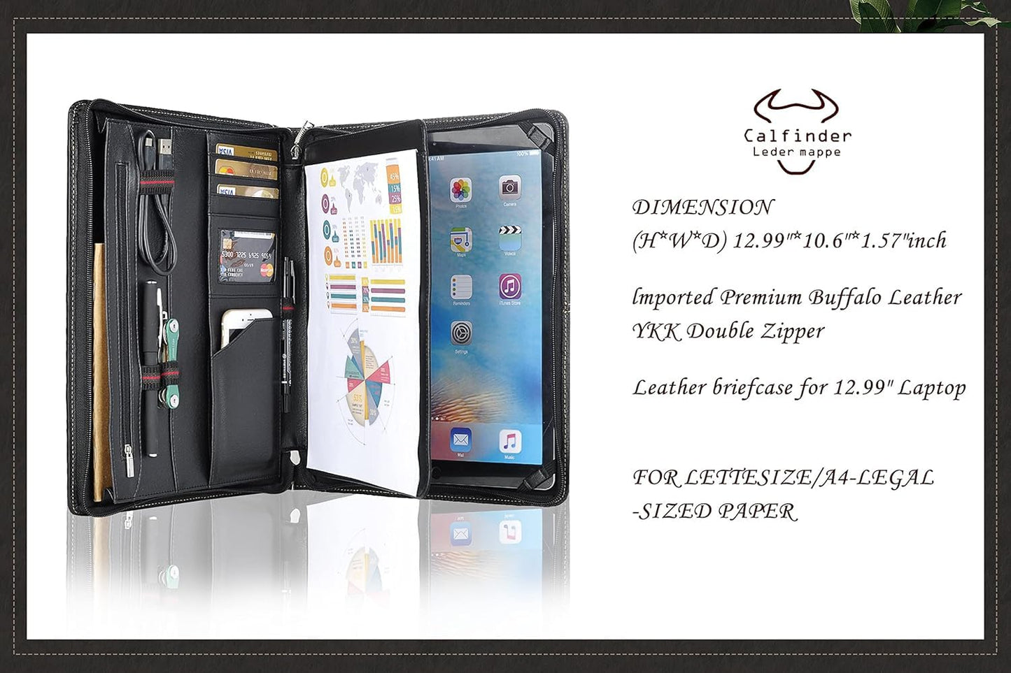 Calfinder conference folder A4 leather with zipper 12.9 inch tablet bag genuine cowhide premium handmade leather portfolio, padfolio, leather folder, document holder, business portfolio, file folder.
