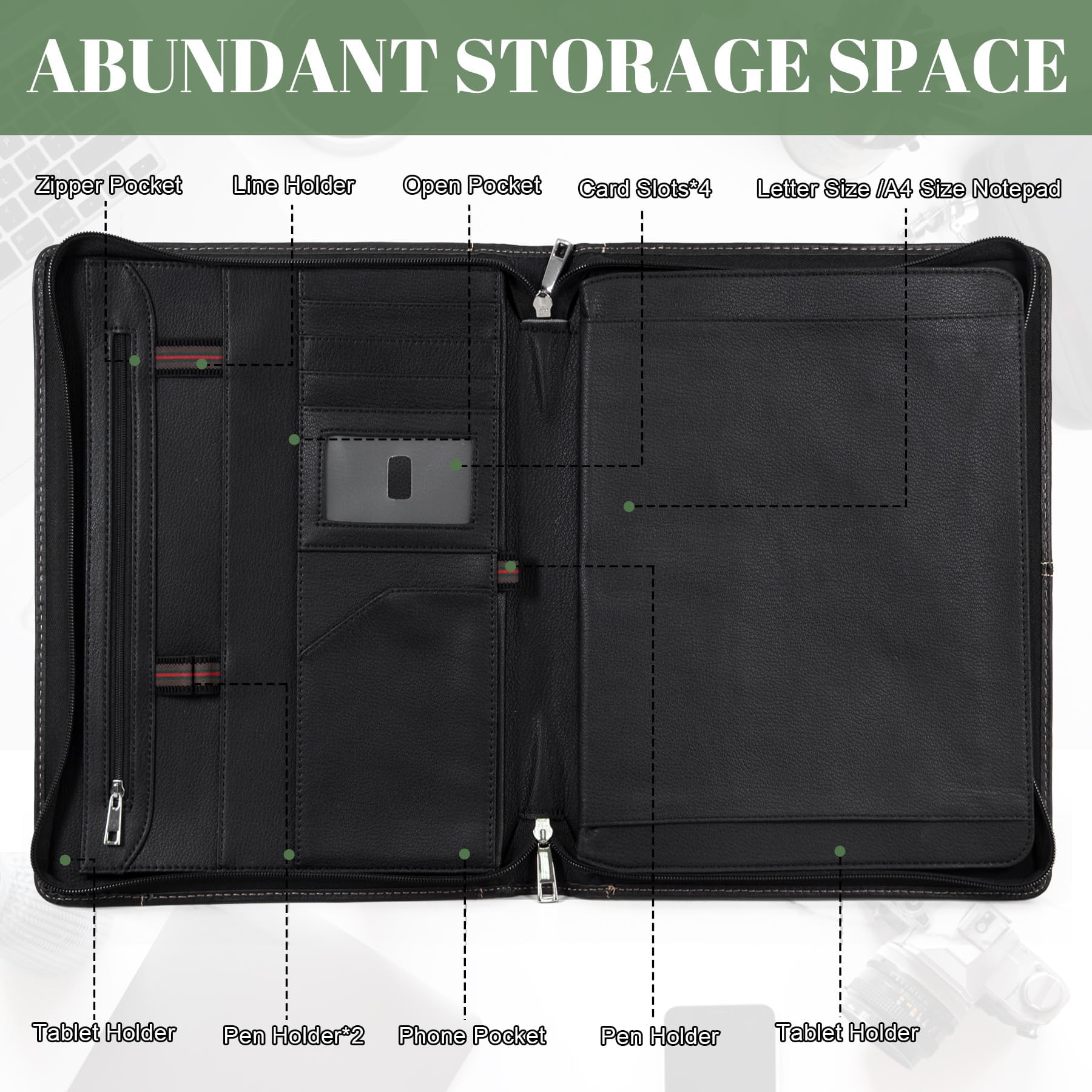 ➤ STRUCTURE - The business folder has 3 main compartments: a solid compartment for 12.9-inch tablets, a vertical slot for A4 notepads, and a multifunctional compartment for office supplies with 4 card slots, 2 pen slots, a zipper pocket, a phone pocket, and a large compartment for A4 documents and contracts. The outer zippered pocket is designed to securely store your valuable notes and quickly and easily access them.