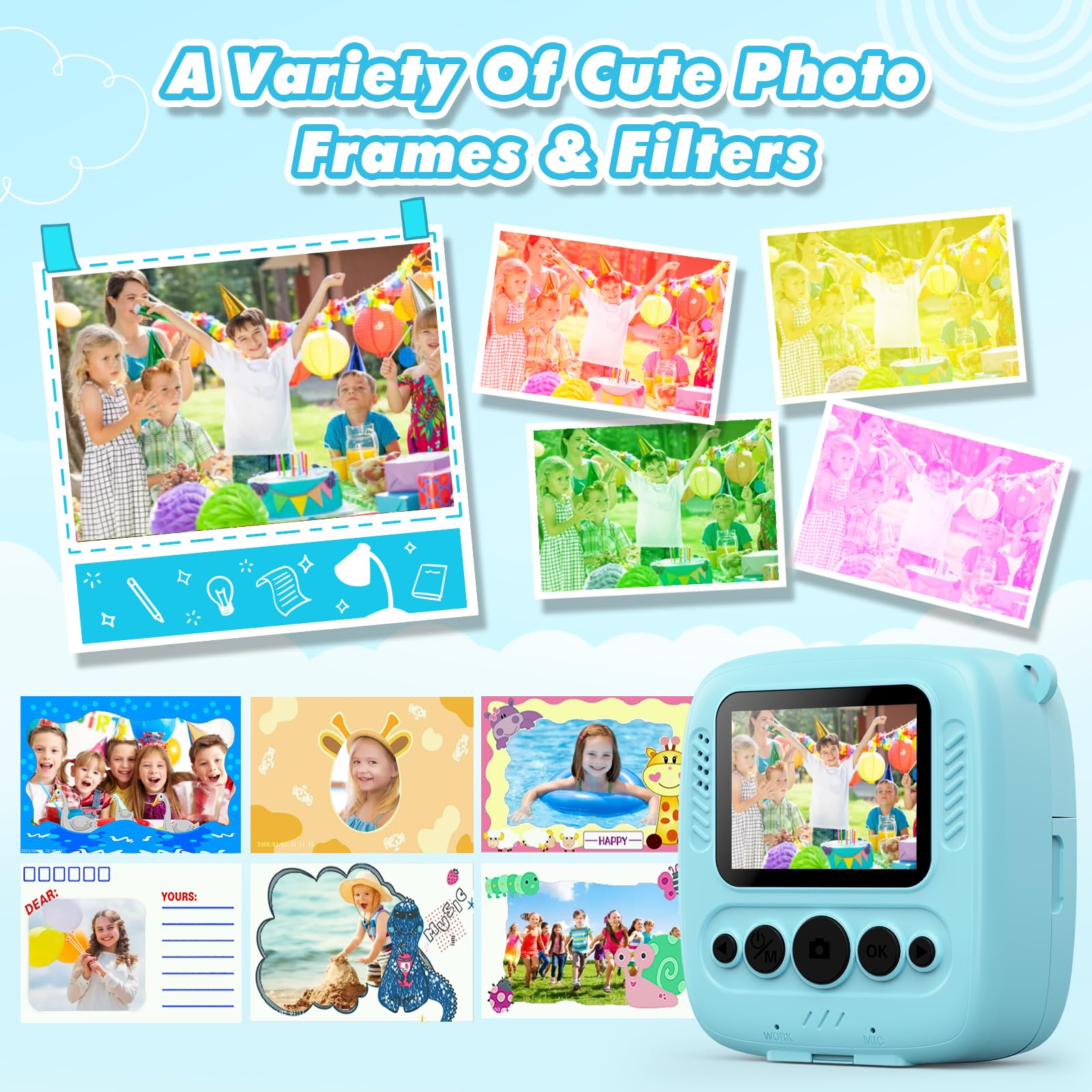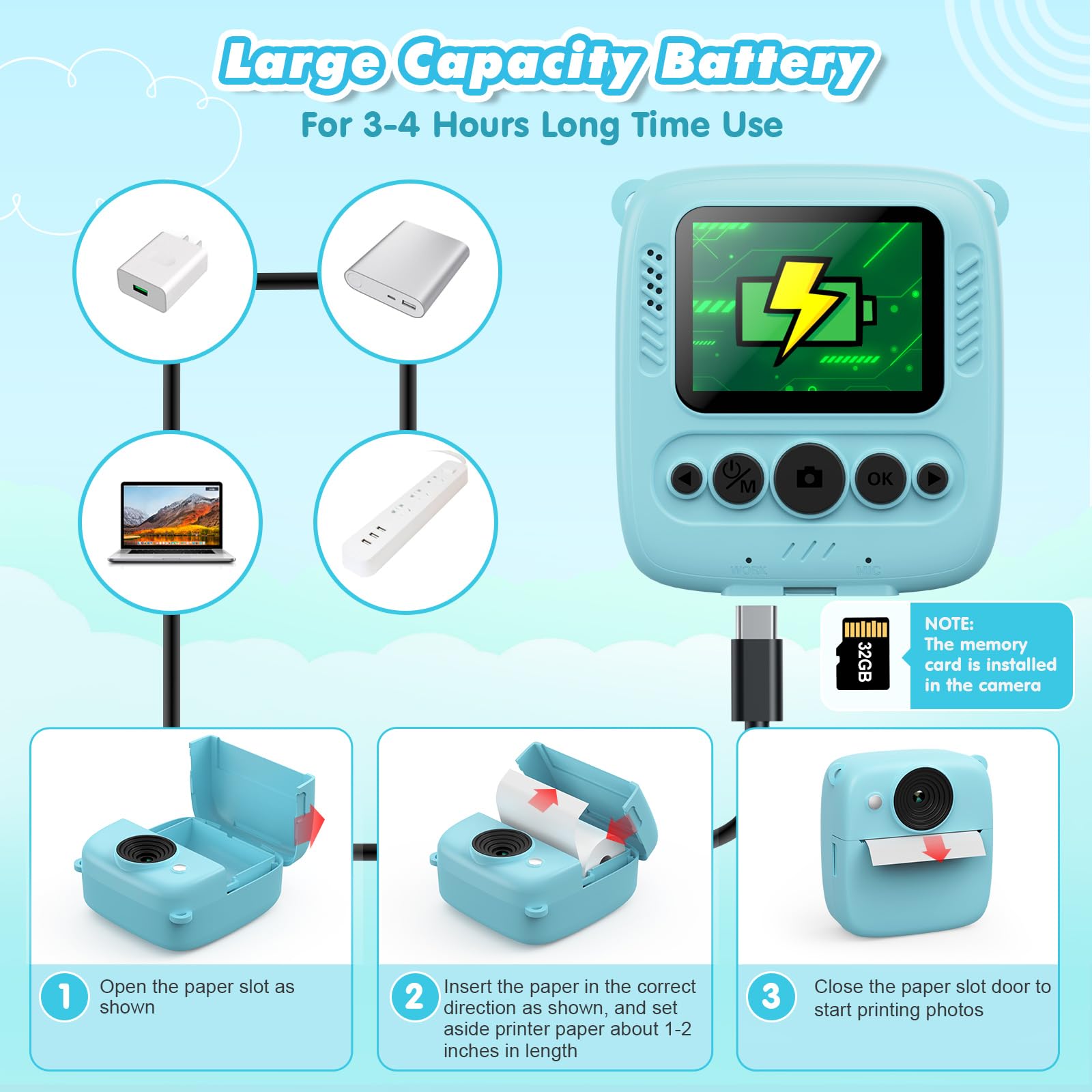 ["Delightful gift for children aged 3-12 years】CalineGam kids camera instant camera is a compact device designed to capture children and instantly print their photos. The digital camera for kids offers a fun and interactive experience that combines the joy of photography with the instant satisfaction of holding a physical photo. A great gift idea for kids for birthdays, Christmas, as a reward for school, Easter, and Thanksgiving.","【One-click photo printing】 The instant camera for kids uses inkless printing technology, allowing them to instantly print their captured photos with just one press of a special print button. The kids camera features various printing modes, 5 filters, and 12 frames to choose from. Kids can paint their favorite colors on the photos and write what they want to say.","【Multifunctional children's toy camera】Upgraded kids camera with a 2.0-inch screen, 3 games, MP3, black and white printing, video recording, and more. It also offers burst shooting, time-lapse, and a wide range of stickers, filters, and frames to enhance the creative experience. Spark kids' interest in the art of photography.","【Long battery life and 32GB card】This instant print camera for kids with 1000mAh battery capacity can continuously take photos for 2-3 hours after fully charged! We have included a convenient lanyard to free up the little kids' hands. Kids digital camera comes with 32GB pre-installed memory in the card slot allowing you to store thousands of photos and hundreds of videos.","【Excellent image quality】The kids instant camera features a high-resolution 48MP lens and 1080P video recording, allowing your child to capture every dynamic moment. The toddler camera for 3-12 year old boys and girls can record every moment in family gatherings, school camping, outdoor activities, party stands, and travels."]