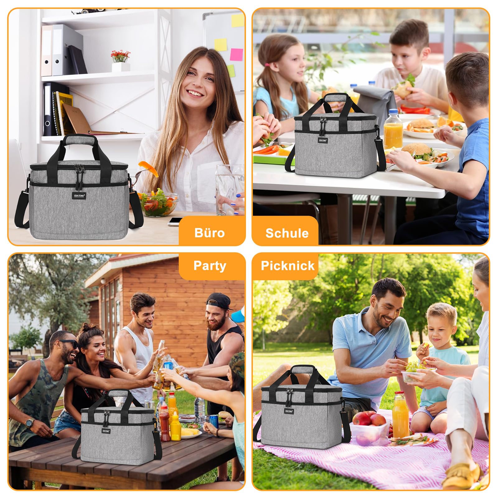 ["Cooler bag 15L: Dimensions 9.6 × 12.4 × 9.1 inches, fits up to 24 aluminum cans 12 oz. Perfect for storing sandwiches, salads, snacks, drinks, and fruit. Great for your storage needs at the office, picnics, the beach, or while traveling.","Insulated lunch bag: This insulated lunch bag can keep food and drinks cold or warm for over 5 hours. The interior lining is made of food-grade PEVA film, allowing you to place food directly into the bag without worry.","Material: The lining of the insulated lunch box bag is made of PEVA film, which is dustproof and wear-resistant. It does not easily melt when frozen and is reusable. Perfect for your office and picnics.","Convenient and portable: This unisex cooler bag features a long shoulder strap, making it easy to carry in hand or over the shoulder. Large lid opening allows for easy packing. Perfect for the office, picnics, camping, BBQs, and the beach.","Leak-proof and waterproof: The foldable cooler bag prevents liquid leaks. Spills can be quickly wiped up with a cloth. The exterior material is water-resistant, dirt-resistant, and abrasion-resistant, protecting the lunch bag from splashes and rain."]