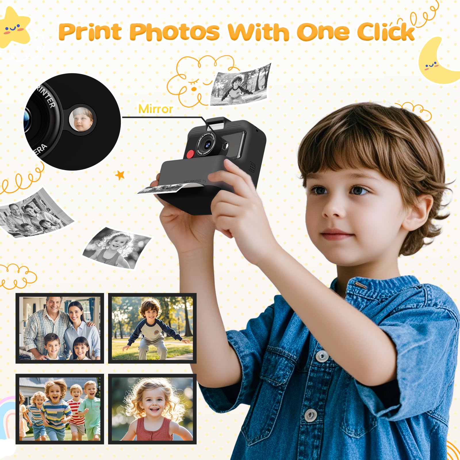 ["2.5K UHD VIDEO RECORDING AND 7 PRINT DENSITIES"] The instant camera for kids supports 2.5K UHD video recording to capture vivid and interesting moments from childhood. Whether it's a birthday party or outdoor adventure, this kids camera allows them to be perfectly featured. The kids camera also offers 7 adjustable print densities and one-touch printing of black and white photos, giving your child the freedom to explore different types of creative fun.