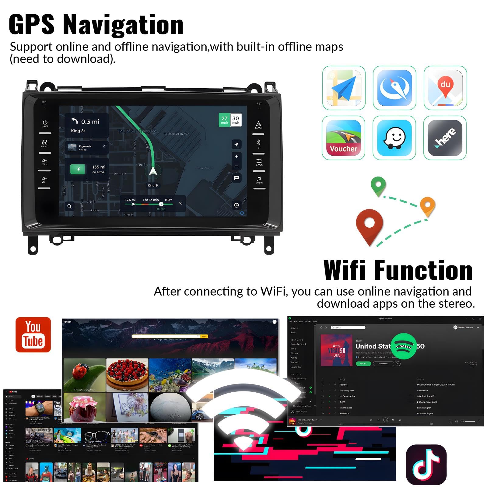 ["đ˛ăAndroid Car Radio 2Din for Mercedes-BenzăSuitable for Mercedes-Benz A-Class W169 A150/A160/A170/A180/A200 (2004-2012), B-Class W245 B160/B170/B180/B200 (2004-2012), V-Class W639/Vito/Viano (2006-2014), Mercedes-Benz W906 Sprinter: Mercedes-Benz Sprinter 2500 (2006-2012) and Mercedes-Benz Sprinter 3000 (2006-2012). Car radio with 8\" touchscreen丨Android 10丨RAM 1G + ROM 16G丨Reverse camera, microphone, and CANBUS.",