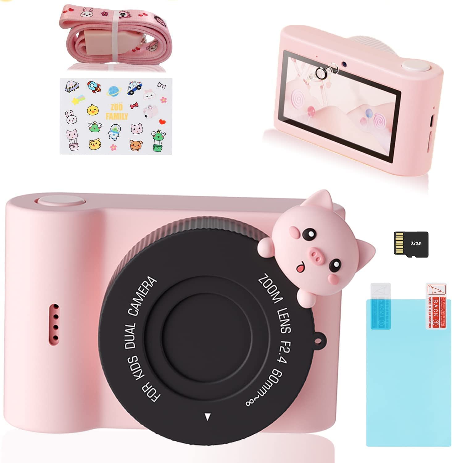 ["💙Multifunctional Kids Camera - This children's digital camera has many functions such as photo taking, video recording, time-lapse recording, automatic shutdown, various cute funny cartoon frames, and filter effects. Your kids can take their own photos.","💙Kids Digital Camera with dual camera - This kids' digital camera with Dual Camera is equipped for easy selfies. Simply open the switch key to enjoy the fun of taking photos. Includes a portable lanyard for hanging, easy to carry and move.","💙Safe Material - This children's camera is made of high-quality non-toxic soft plastic, more safe and comfortable for kids' skin. The shockproof shell provides effective protection against falls.","💙32GB SD Card & 1000-mah Battery - Kids camera with built-in rechargeable 1000mAh lithium battery, supports hours of use. Continuous photo taking for 1-2 hours after full charge! Kids camera comes with 1*USB data cable & 1*32GB micro SD card for storing thousands of photos!","💙Best Gift for Kids - This digital camera for kids is the perfect gift for children for birthdays, New Year, Easter, and Christmas. Package Includes: 1*Kids Camera, 1*32GB SD Card, 1*Lanyard, 1*USB Cable, 1*Cute Cartoon Sticker, 1* Protective Case, 1*User Manual!"]