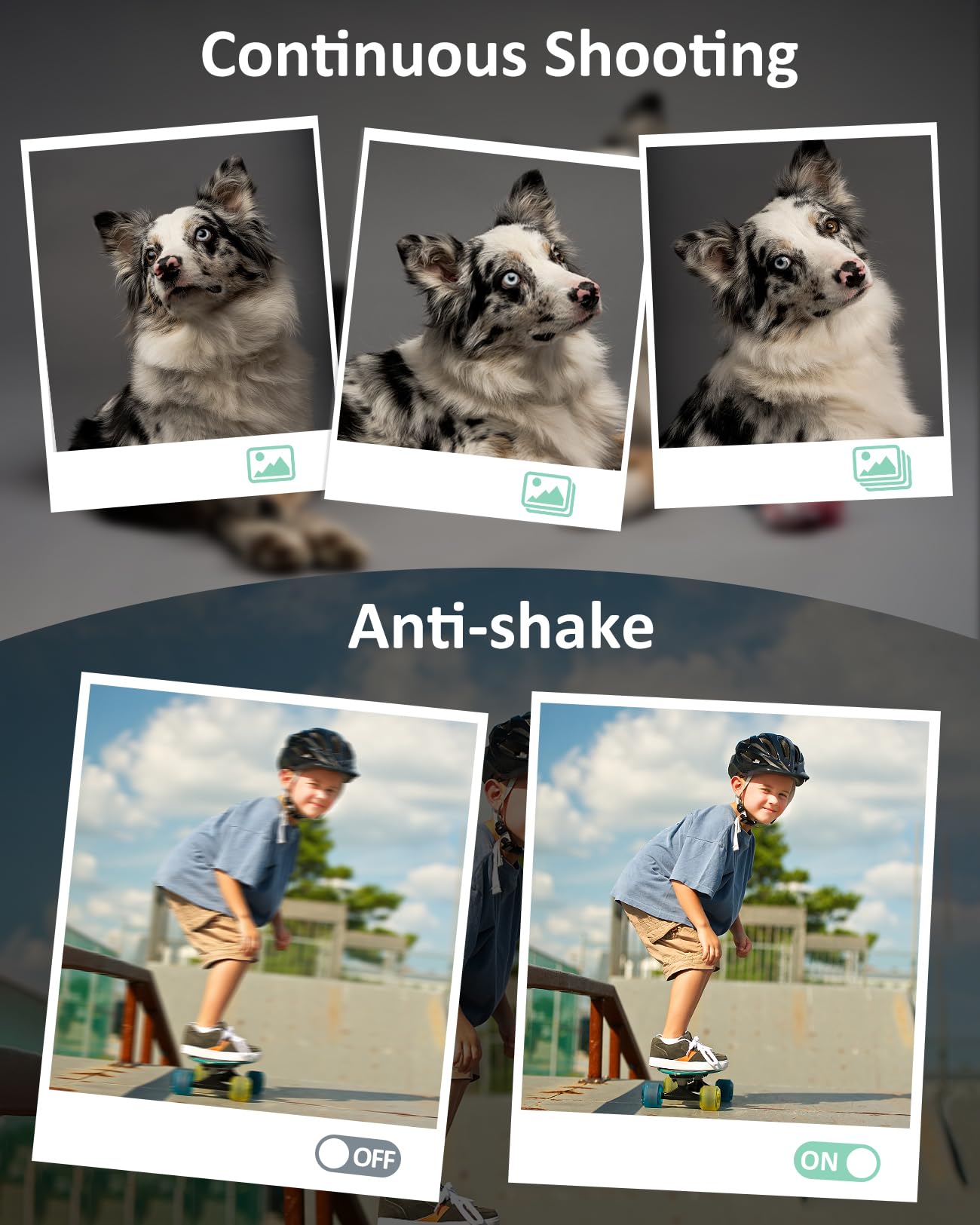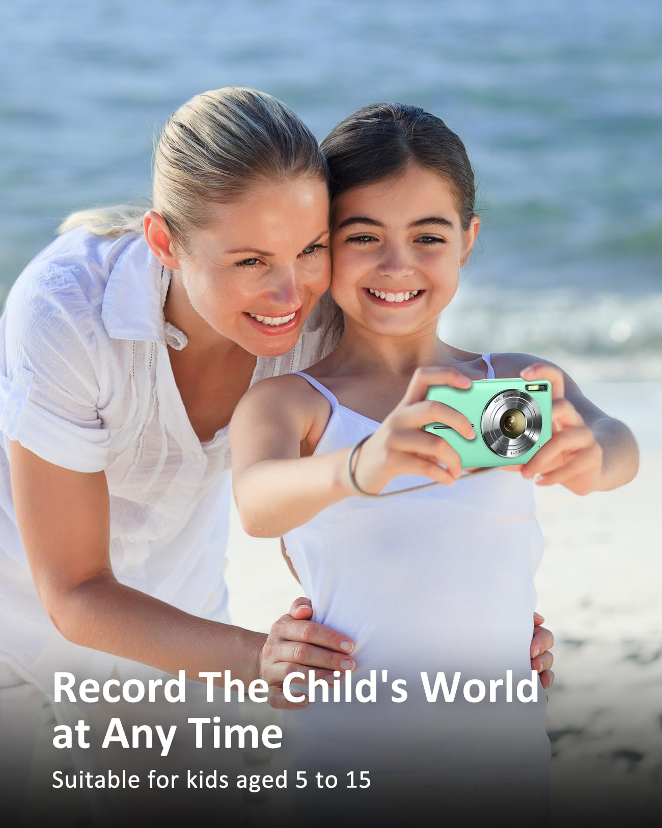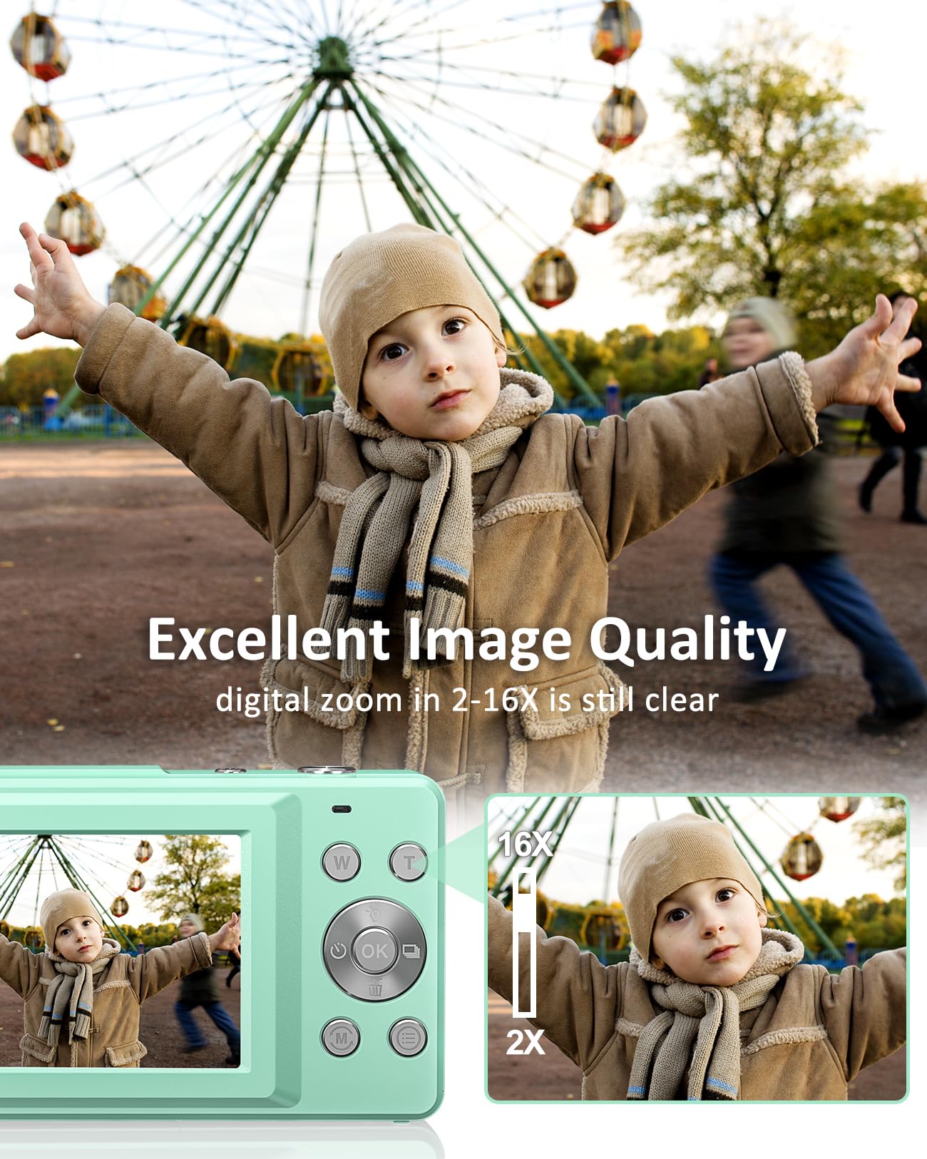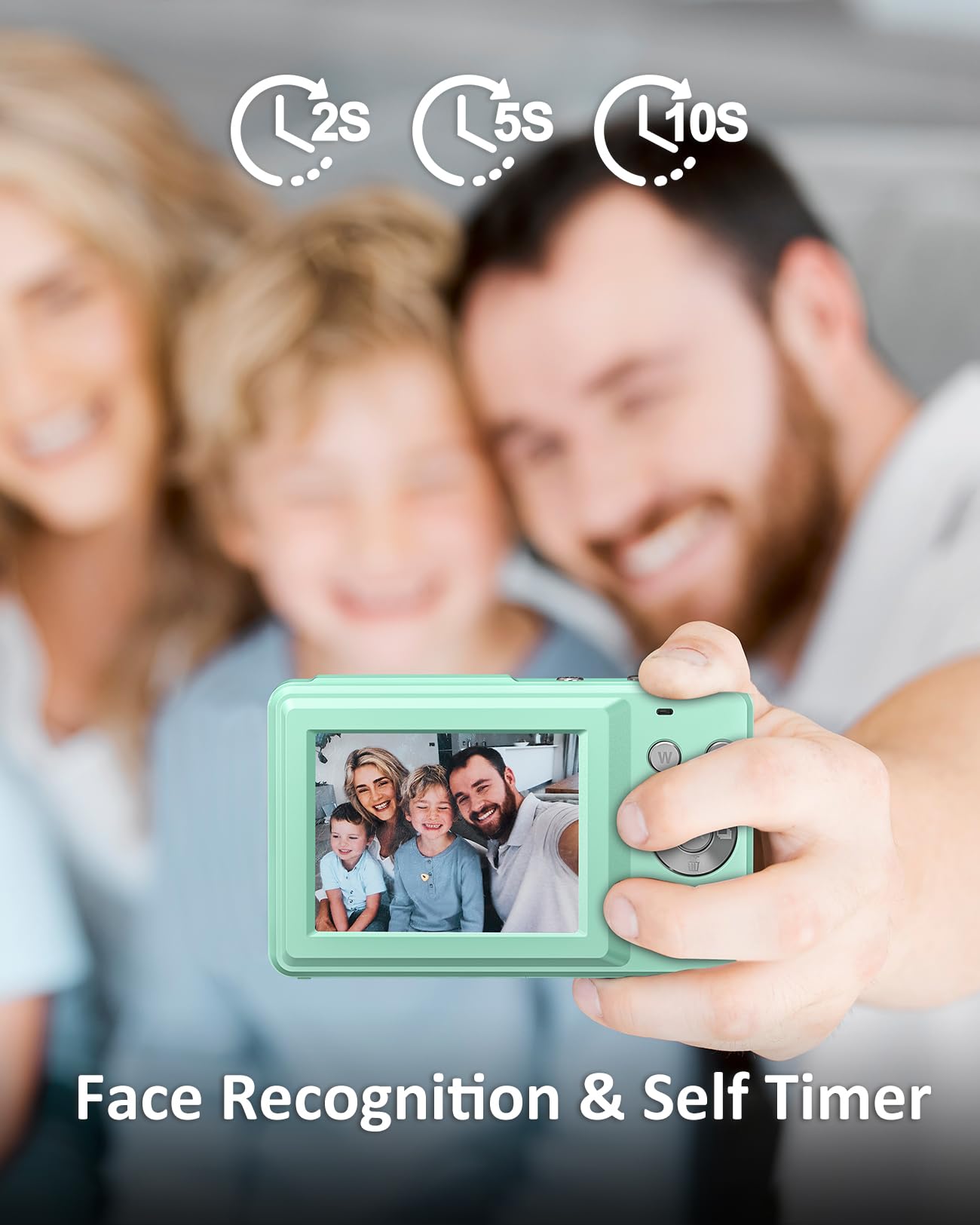 ["FHD 1080P & 44MP & Anti-Shake: With this digital camera featuring Full HD 1080P resolution and 44MP, you can capture ultra-high resolution videos and photos.","Multifunctional Camera: This digital camera has a powerful 16X digital zoom, self-timer, face recognition, continuous photo shooting, timed photo shooting, 20 filters, CMOS sensor, fill light, and can also be used as a webcam. Enjoy video calls or live streaming, all functions ensure better recording.","Suitable for any scene: With this digital camera, you can take photos and vlogs at opening ceremonies, parties, and while traveling. You don't need any photography skills to use this camera, just press the photo button gently. It's a great camera for kids, teenagers, beginners, and seniors, perfect as an Easter gift, birthday gift, or holiday gift!","Simple and portable: The digital camera is lightweight and compact, just the size of your hand, only 100g and has a strap. Kids can hang the digital compact camera on their hand or put it in their pocket, carry it with them, and record their fun life anytime.","Packing list: The gift box includes digital camera*1, battery*2, 32GB card*1, Type-C charging cable*1, lanyard*1, fabric bag*1, user manual*1. For a better experience, please insert a 32G TF card (Max support 32GB) before use."]
