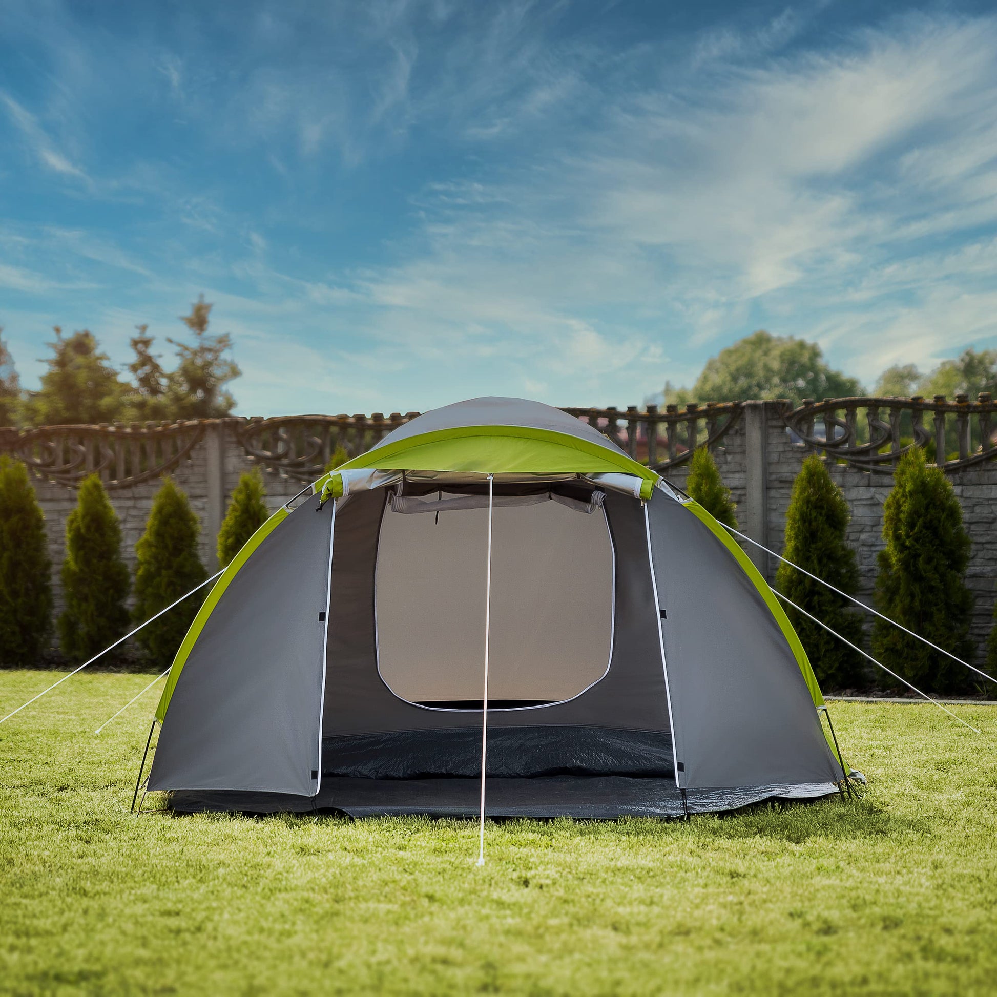 "Tent with mosquito net and ventilation system - Integrated mesh on doors and windows for insect protection and good air circulation. Perfect for summer nights and warm regions"