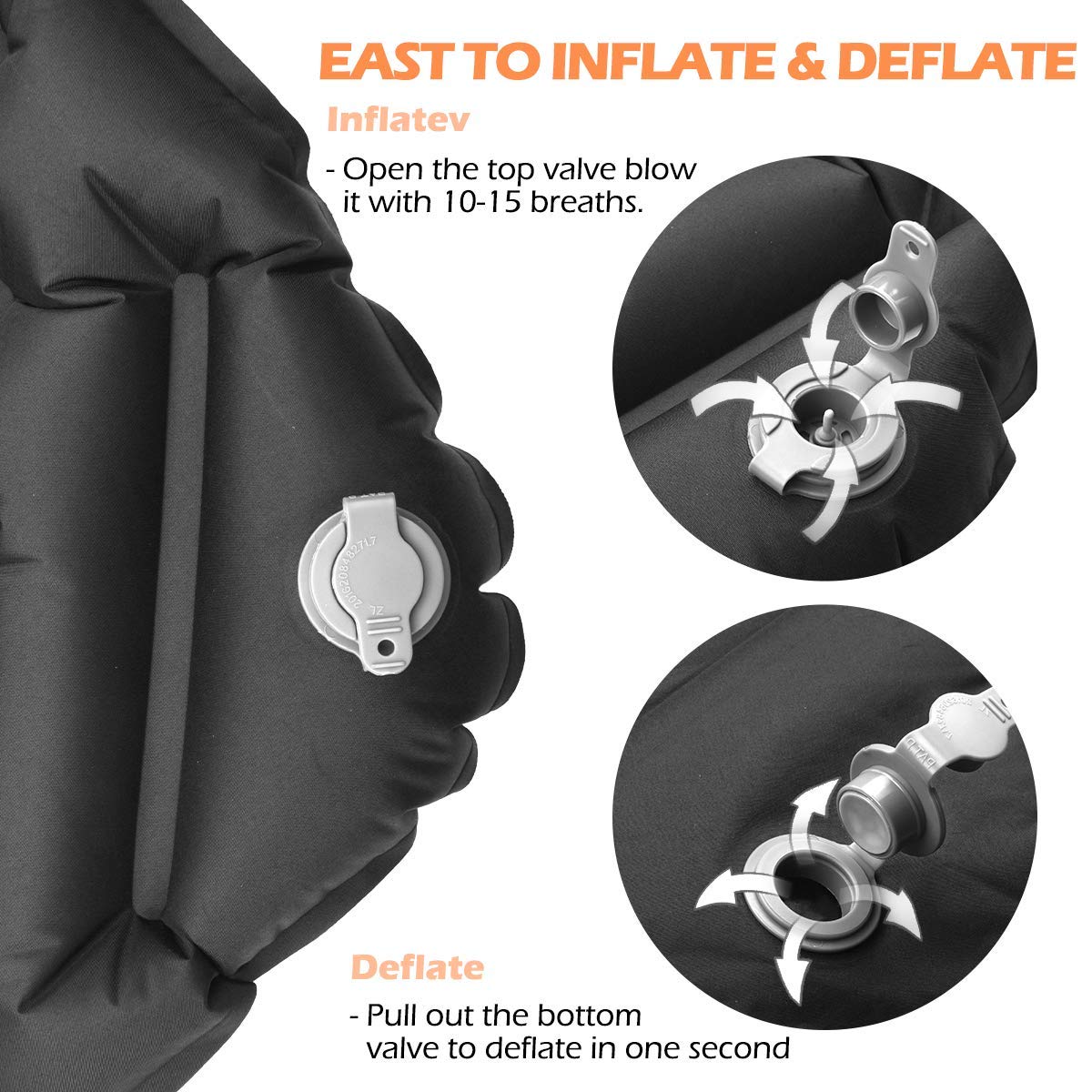 ["【Quick Inflation】The camping mat inflates super quickly with 10-15 full breaths for adults and deflates in seconds through the air valve. Special valve design, when you inflate, the air only goes in, not out. (Air pump not included)","【Premium Quality Material】This camping mat was designed for very harsh weather conditions. It is made of 40D Ripstop Nylon with waterproof function. It is also extremely tear, puncture, and abrasion resistant.","【Ergonomic Design】Size: 190 x 59 x 6 cm, the camping mat is specially designed for natural ergonomics. Whether you use the camping mat on the ground/rocks/grass/sand/beach, our mat provides a comfortable sleeping experience and maximizes relief for you.","【Lightweight & Compact】Compared to other mattresses, this camping mat weighs only 530g and can be easily stored in a backpack after rolling it up. Due to its low weight and volume, this camping mat is ideal for outdoor activities such as mountain tours, cycling, or hiking tours.","【Say Goodbye to Your Pain】Do you suffer from back and neck pain every time you go camping? You will never have to sleep uncomfortably again when you buy this soft camping mat! Our outdoor camping mat conforms to your body and keeps it away from the cold, hard ground, allowing you to sleep anywhere like a baby."]