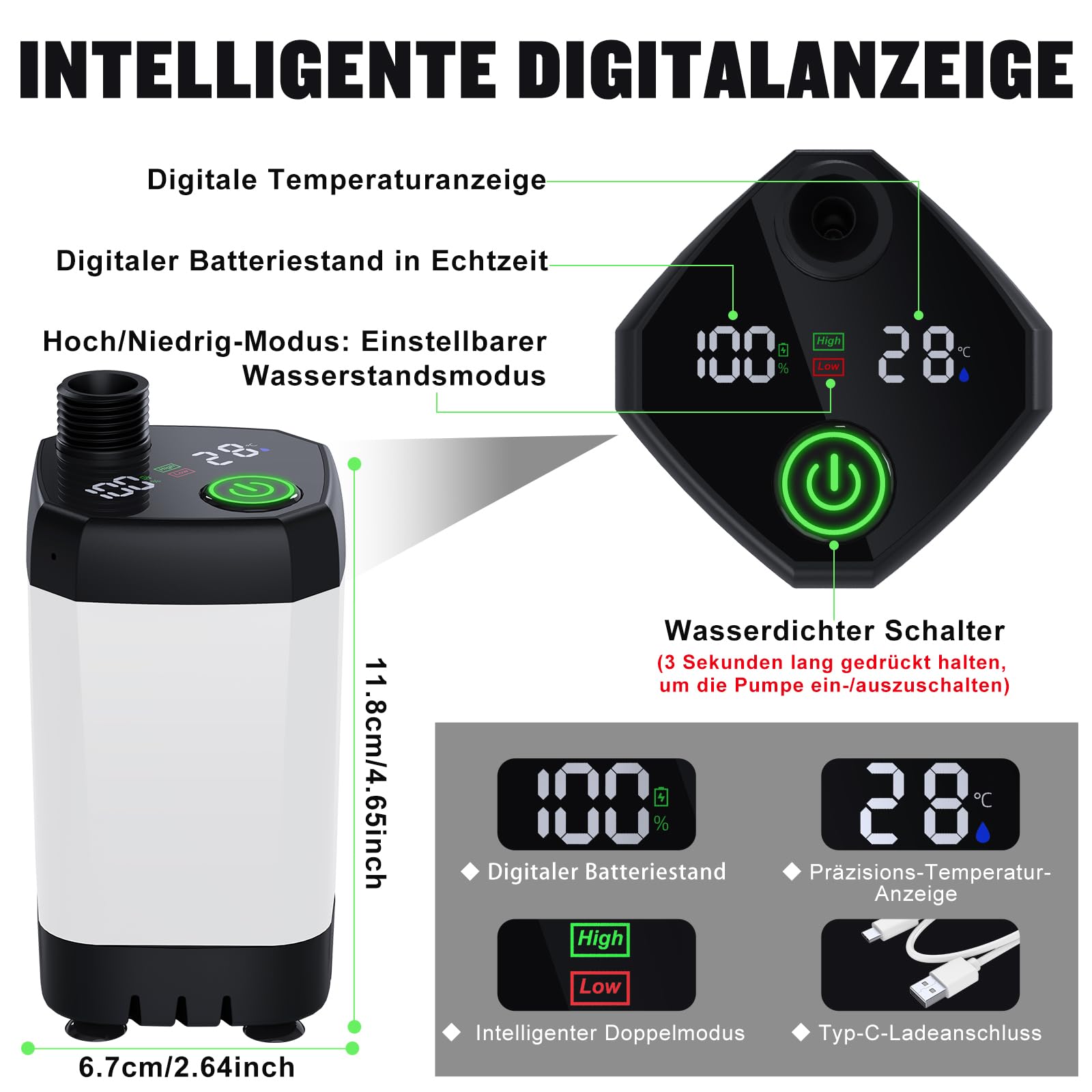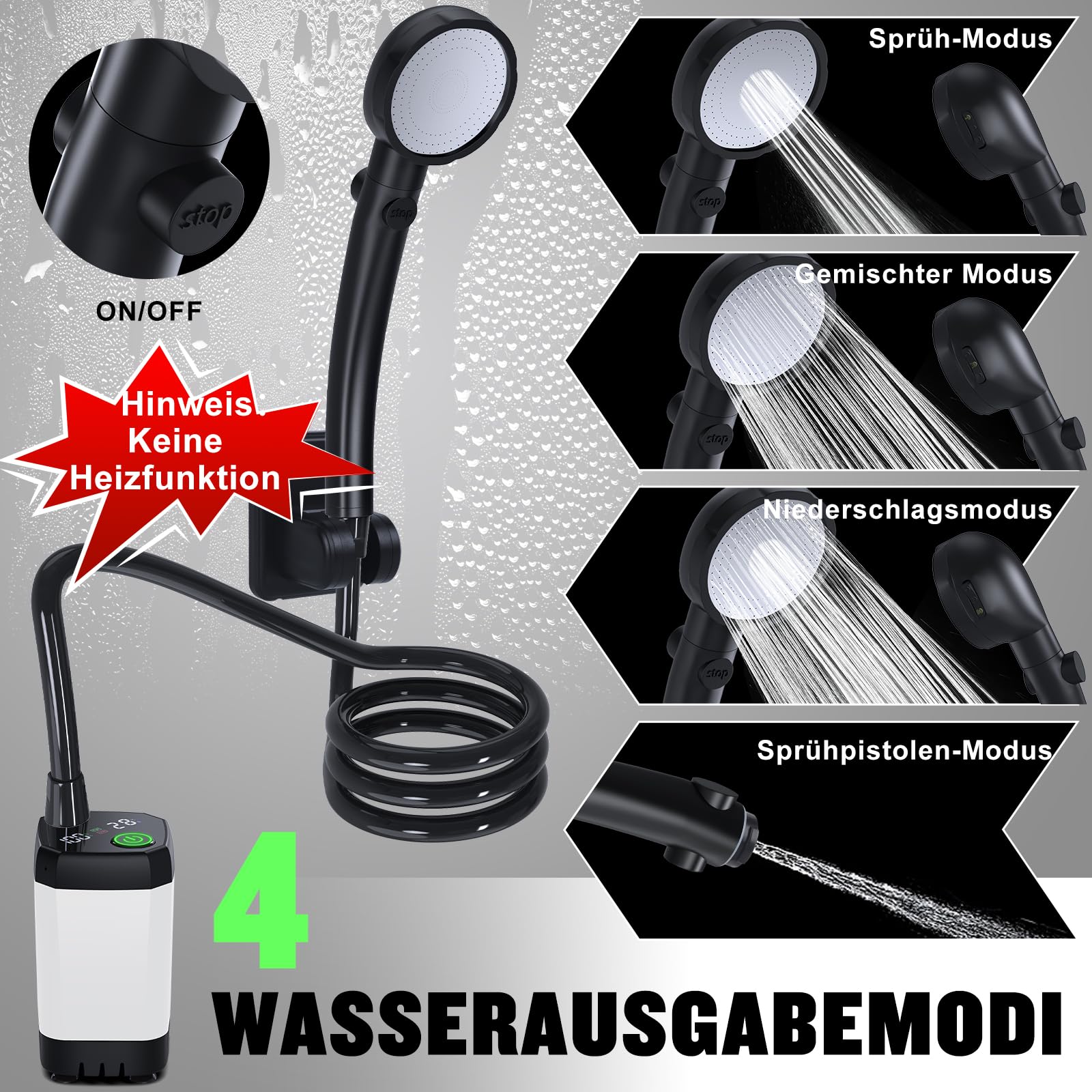 ["【Smart Operating Protocol】① This camping shower does NOT have the function of heating water. ② To optimize your camping shower experience, always immerse the device in water BEFORE pressing the power button - this activates the dry run protection system. ③ Critical reminder: Never expose the portable camping shower to liquids above 140°F to avoid damaging the device.","【Enduring Performance - 6000mAh Battery Capacity】The Portable Camping Shower features a built-in 6000mAh high-capacity battery, which can work continuously for 120-150 minutes when fully charged. Portable Camping Shower with Type-C connection can be conveniently charged by mobile phone charger (5V-2A), mobile power, laptop, or car USB output.","【Waterproof and Sturdy - Suction Cup Design on the Bottom】The camping shower with pump is waterproof with an IPX7 rating, you can immerse the entire body in water, and the charging port comes with a waterproof cap, making it safe to use. The suction cup design on the bottom of the camping shower pump ensures that the shower pump is firmly attached to the bottom of the bucket, preventing it from tipping over.","【Lightweight and Portable - Wide Range of Applications】Portable camping shower with battery kit comes with a mesh organizer bag, easy to carry and store. Suitable for indoor and outdoor showers, garden, camping, BBQ, hiking, beach, travel, children's bath, pet cleaning, car washing, and plant watering.","【Four Water Discharge Modes】The portable camping shower head has four convenient water discharge modes, switch between different modes to meet the usage needs in different scenarios, you can also choose between two speed modes to adjust the water flow to your liking. In addition, the upgraded motor runs quietly, providing you with a peaceful outdoor camping shower environment."]