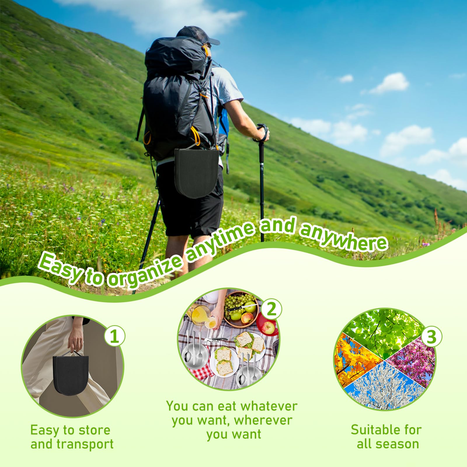 ["Camping Cutlery Set: Cutlery set consists of 2 x forks, 2 x spoons, 2 x table knives, 1 x steak knife, 2 x 8 inch stainless steel plate, 1 x steak clip, 1 x bottle opener, 1 x portable storage bag, 2 x napkins, perfect for couples or friends when camping or picnicking","Material: Kitchen utensils are made of stainless steel, hard and sturdy, environmentally friendly, durable and rust-resistant, smooth surface, easy to clean, can be used for a long time, Each utensil has its own compartment, so the cutlery remains safe and stable during transport","Portable Camping Cutlery Set: Storage bag is made of a sturdy canvas polyester outer layer and has grids inside, can help you organize, sort and prevent dishes from falling out, storage bag protects your utensils from damage from accidental dropping, allowing you to use them for a long time","Easy to Clean: Made of high-quality food-grade stainless steel material, dishwasher safe and can also be easily cleaned with a damp cloth and reloaded into the bag, and then you can continue your journey, Cutlery set can be stored clean and compact in the included bag, taking up minimal space","Perfect Gift: Portable outdoor camping cutlery set is perfect for camping, hiking, backpacking, picnics, outdoor adventures, mountain climbing, barbecues, perfect gift for your family and friends for any occasion"]