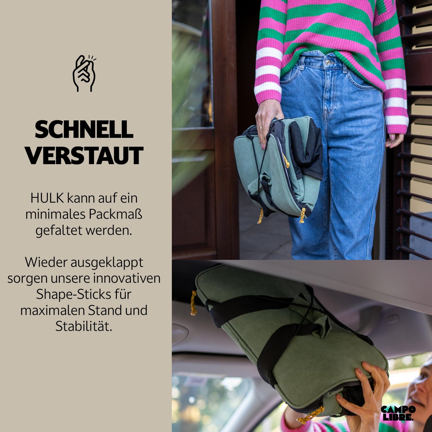 "Campo Libre. QUALITY Our lunch bag is made of sturdy premium Oxford canvas, waterproof PEVA, and high-quality, waterproof zippers. Additionally, the cooler bag has a reinforced bottom. PERFECT ALL-ROUNDER SIZE The insulated bag has a capacity of 30 liters (28+2) and is suitable not only for transport in the car but also can be used as a practical shoulder bag thanks to the comfortable carrying strap. DURABLE THERMAL FUNCTION Our large cooler bag keeps your drinks and food cold and warm for a long time thanks to the extra-thick 8mm PEVA insulation. VERSATILE: HULK DURABLE THERMAL FUNCTION is the perfect cooler bag for on the go and universally usable. It is suitable for outdoor trips of all kinds. SPECIAL FEATURES Our cooler box is foldable. By unfolding it, you transform our mini cooler bag into a box with a capacity of 30 liters (28+2) (including front pocket). The ShapeSticks included in the delivery provide the cooler bag with maximum stability and prevent it from collapsing during use. This makes it easy to fill and transport its contents safely."