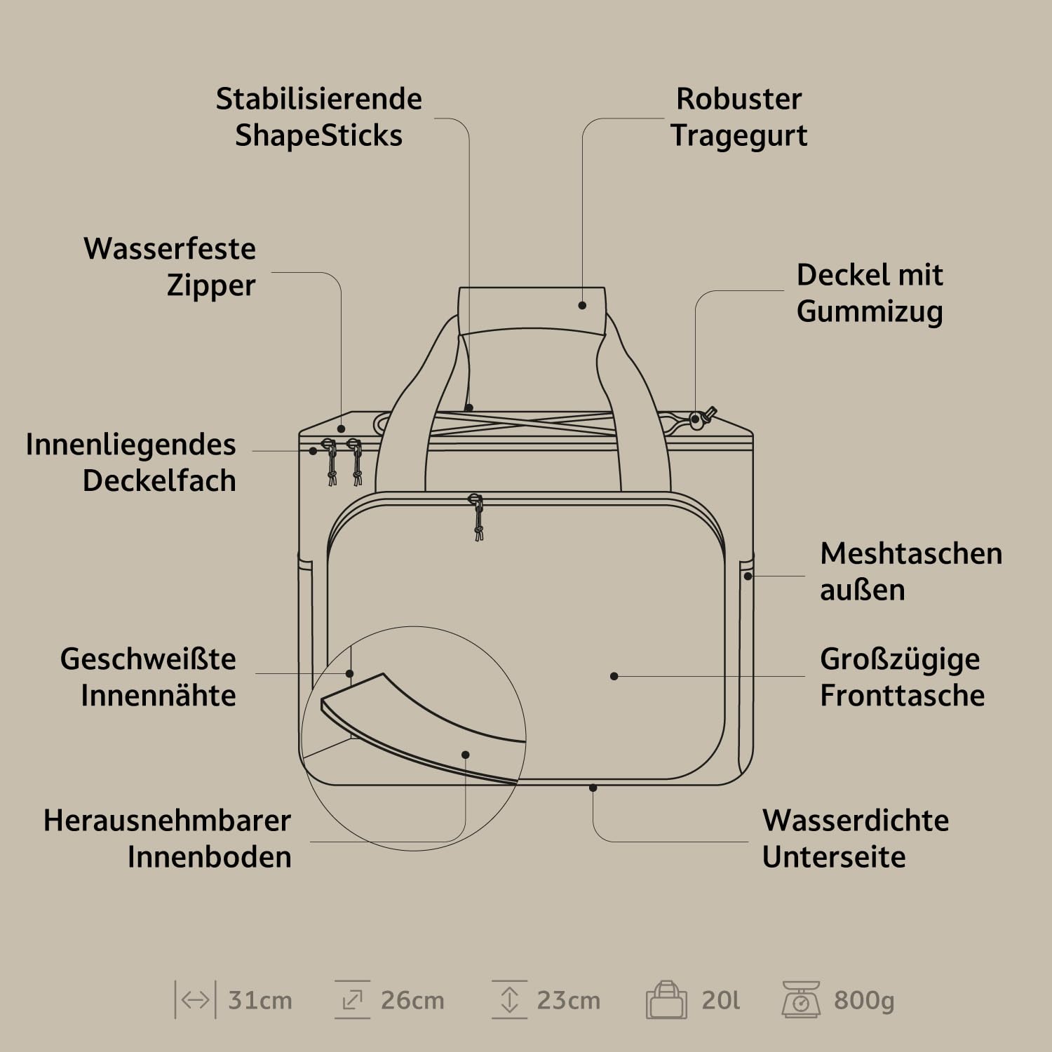 ["SPECIAL FEATURES"] Our cooler box is foldable. By unfolding it, you transform our mini cooler bag into a box with a capacity of 20 liters (18+2) (including front pocket). The ShapeSticks, included in the delivery, provide maximum stability to the cooler bag and prevent it from collapsing during use. This makes it easy to fill up and transport its contents securely.