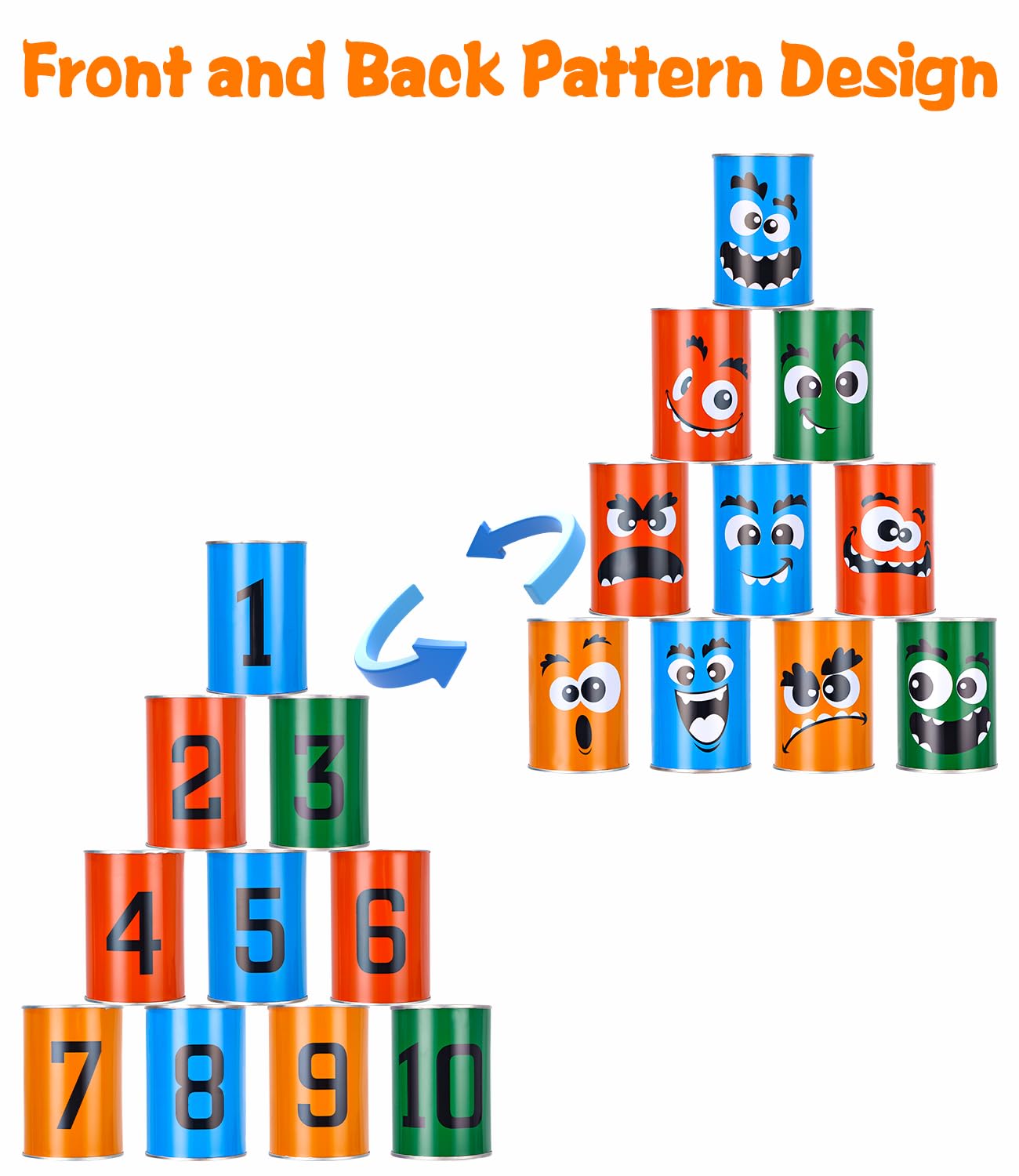 ["SET CONFIGURATION: This throwing game includes 10 tin cans and 3 bean bags. 10 tin cans each have an emoticon, adding fun to the game, and there are also numbers on each tin can to make it easy for people to keep track of the score, making it even more convenient for players to make winning or losing judgments. Bright colors not only bring visual impact, but also a pleasant mood.","Material Safety: The tin cans are made of high-quality tinplate, which is softer, corrosion-resistant, non-toxic, high-strength, and easily deformable, so you don't have to worry about accidental injuries even during the liveliest game. The bean bag is made of environmentally friendly, non-toxic fabric with soft padding, allowing children to enjoy the throwing fun safely and protected.","Learn and have fun: Aiming and throwing not only trains body coordination, but also teaches goal setting and strategic adjustment, every successful throw is a small victory for oneself, promotes children's self-confidence and endurance, every hit is evidence of growth, making the perfect combination of learning and entertainment.","Parent-child interaction: It is not just a game, but also an opportunity for emotional exchange between family members. Parent participation not only teaches children teamwork, but also deepens the emotions between parents and children in shared play, builds a bridge of love, and leaves valuable family memories.","PLAY AS YOU LIKE: Whether on a sunny field or in a cozy living room, this throwing toy is quickly set up and ready to play. Its flexibility allows for fun gameplay anywhere and creates a space full of laughter for children, anytime, anywhere. It is a good garden game, outdoor game for kids, and for children's birthday games."]