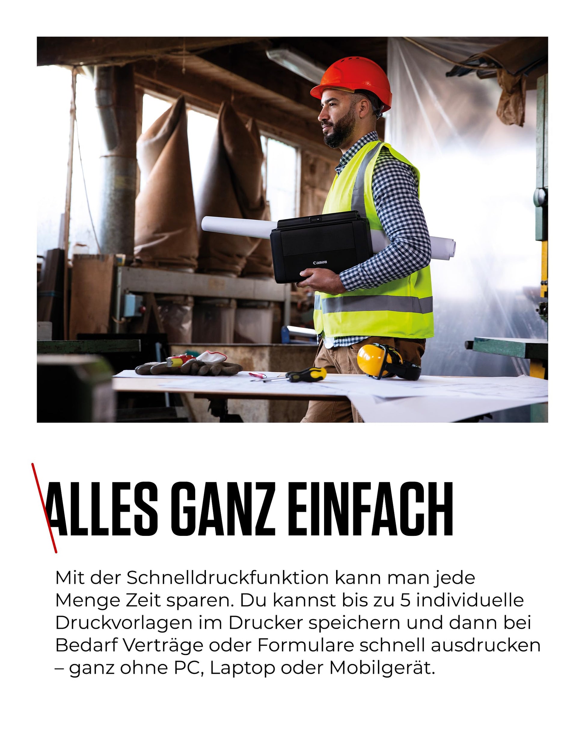 ["MOBILE PRINTER FOR ON THE GO - The PIXMA TR150 is slim, lightweight, and sturdy. Ideal conditions for the mobile office. With a full battery charge, you can print up to 330 pages, and in the office, at home, or on the go, you can also recharge the battery via a USB Type C cable. Reliable printing for borderless photos and documents up to A4 size. With a printing speed of 9 ISO pages per minute in B/W and 5.5 ISO pages per minute in color, the printer works quietly and quickly","SHARP IMAGE QUALITY - Even in dark areas, the prints are razor-sharp. The hybrid ink system with a special pigment black ensures razor-sharp text prints and the dye-based color ink prints vibrant photos with color stability of up to 100 years when stored in an album.","SIMPLE AND WIRELESS CONNECTION - With the Connect button, the printer is quickly connected to a mobile device and can be printed with the Canon PRINT app or without the app via AirPrint (iOS), Mopria (Android), or Windows 10 Mobile. No internet router available? No problem! Wi-Fi Direct helps. In addition, the 3.6 cm (1.44-inch) OLED display allows for easy operation and checking of ink levels and connection","INDIVIDUALLY CUSTOMIZABLE - With the Quick Print function, you can save a lot of time. You can save up to 5 individual print templates in the printer and then quickly print contracts or forms as needed – without a PC, laptop, or mobile device","DELIVERY CONTENTS - Canon PIXMA TR150 with battery in black; USB Type C cable; LK-72 battery holder; Power adapter; Power cable; Ink: PGI-35 pigmented black and CLI-36 CMYK color; Printhead; Setup CD-ROM; Quick Start Guide"]