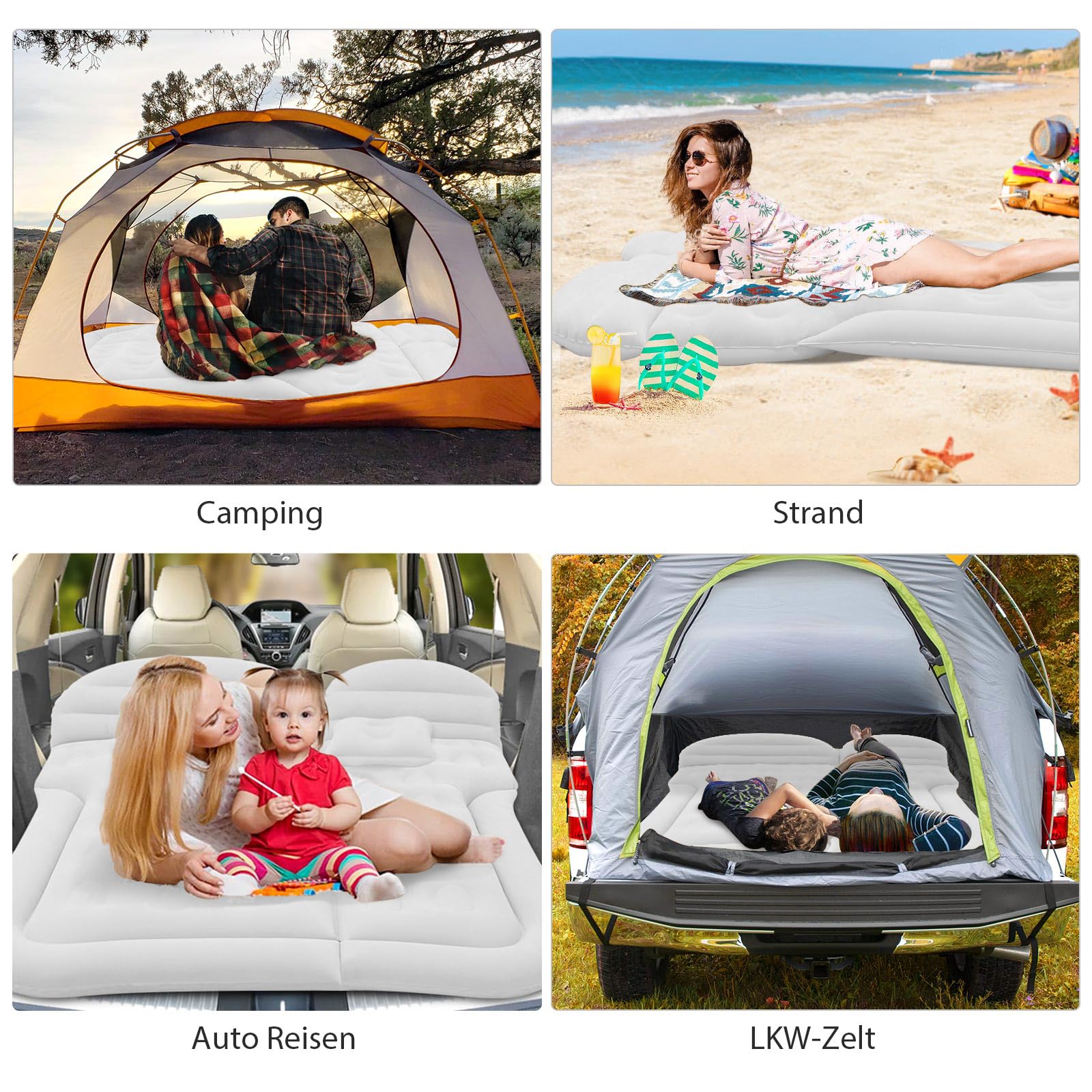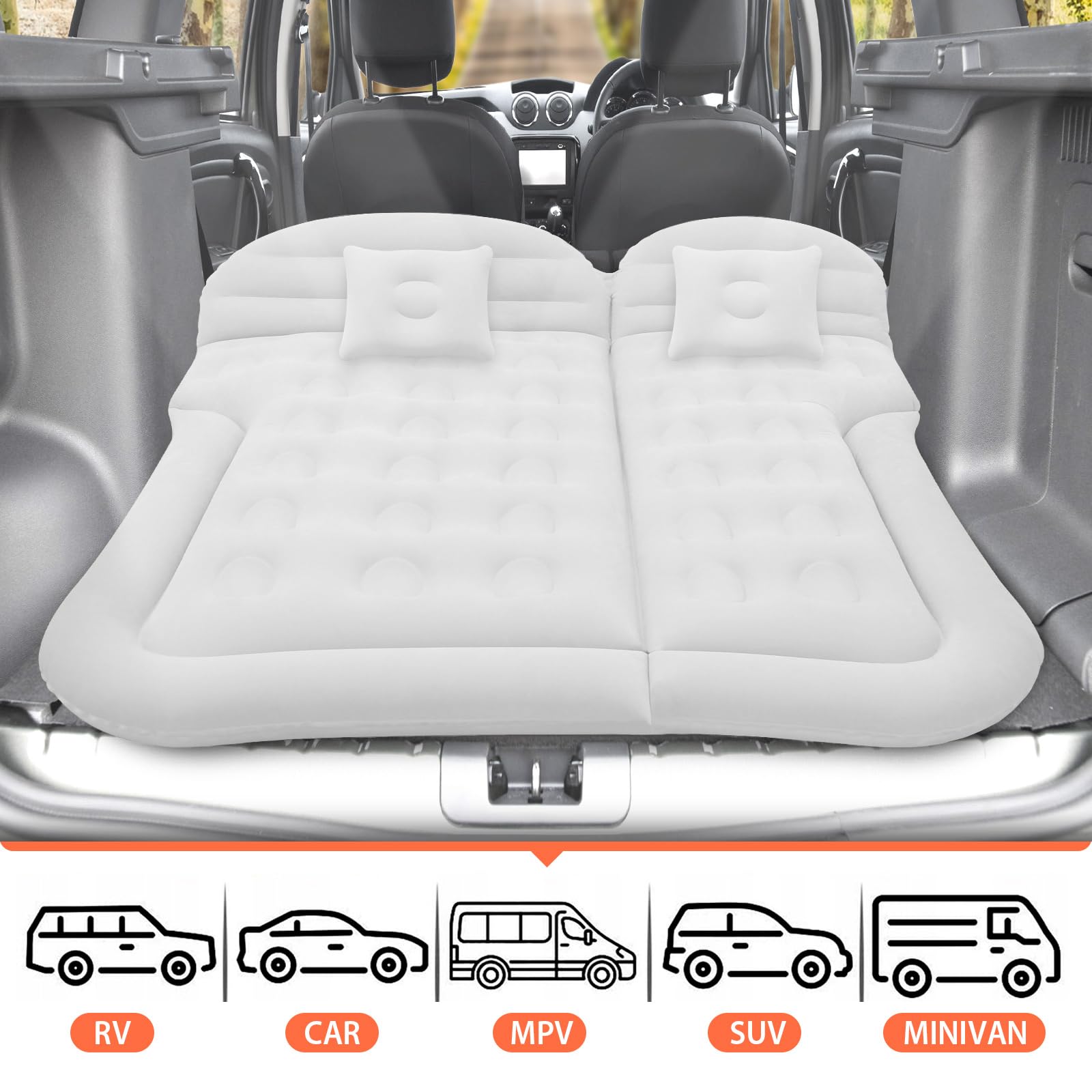 ["Comfortable Material】This SUV air mattress features a double-sided comfortable material. The flocked surface provides you with an extremely soft touch and is breathable. The PVC surface ensures coolness and skin-friendliness.","【Multifunctional SUV Mattress】This car travel bed is equipped with 6 individual airbags. Compatible with SUV cars, can be used at home as a bed, car sleeping pad, travel bed, camping bed, compatible with most car rear seat models (sedan, SUV, MPV...). Perfect for any occasion (tent camping, traveling, beach) is your reliable travel companion.","【Suitable for All Weather Conditions】This camping pad is made of improved polymer material, with a thickened design. Supports a temperature range from 23 °F to 122 °F. Maximum load capacity up to 550 lbs, allows 2-3 adults to use and no leakage.","【Easy to Inflate/Deflate】Car mattress equipped with an electric air pump and 3 types of inflatable nozzles supports use both in the car and at home. With the pump, you can quickly inflate or deflate the air bed to the desired firmness in 6-10 minutes. It can be folded and stored in a storage bag when not in use, easy to carry and does not take up space.","【Satisfactory After-Sales Service】We do our best to provide customers with satisfactory products and services. If you encounter any problems during use, feel free to contact us. We will respond within 24 hours to solve the problem for you and provide a satisfactory answer."]