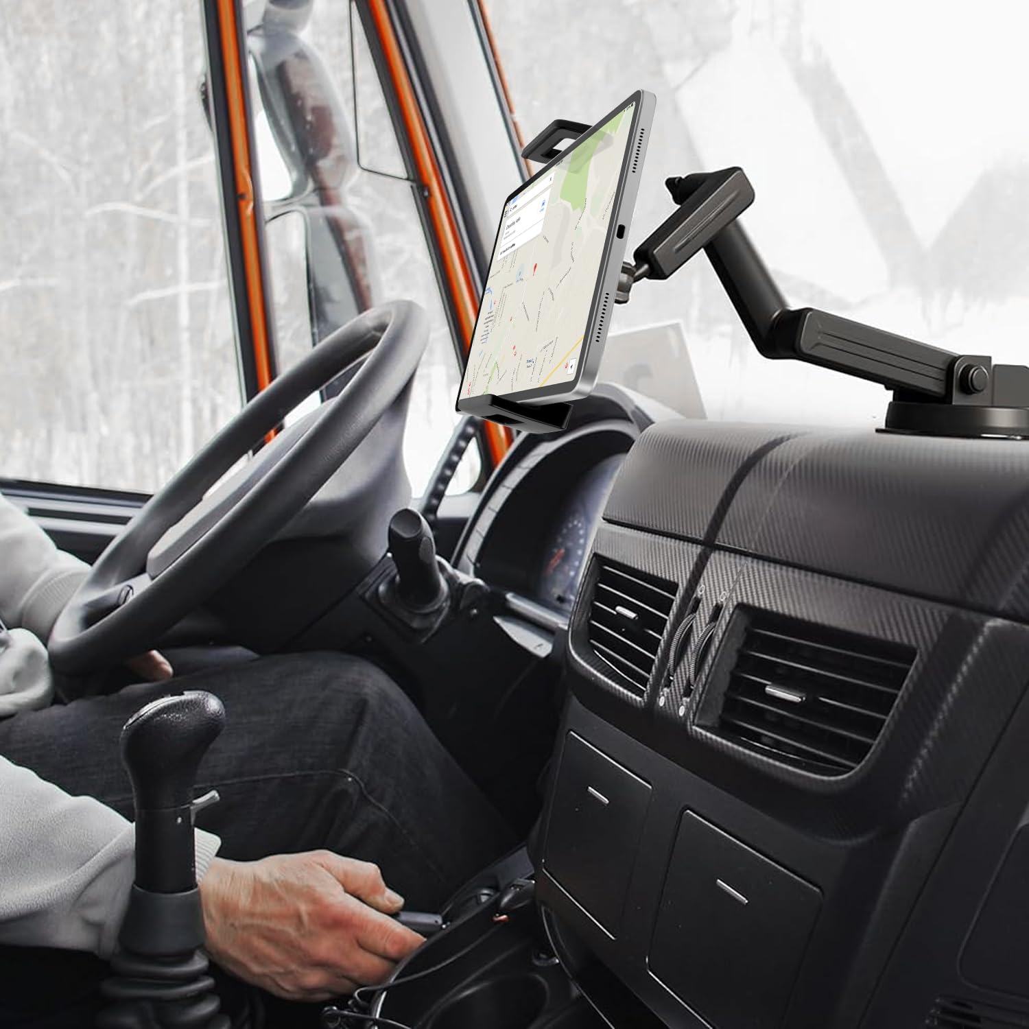 ""πͺ Robust grip for the road warrior - Unleash the power of our car tablet holder, equipped with a powerful 3-point arm and a base that grips and doesn't let go. This iPad holder for trucks acts as a vibration protection that conquers the toughest challenges on the open road while providing a crystal-clear view. The additional leverage of the lever lock at the base makes it the ultimate choice for hardworking truckers demanding nothing but durability.