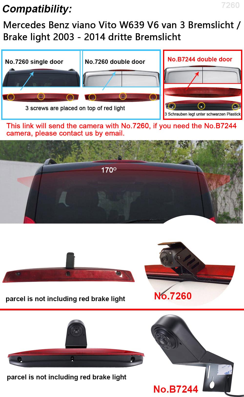 ["π Brake light camera brake light reverse camera. Replacement for Mercedes Benz viano Vito W639 V6 van 3 brake light/Brake light 2003-2014 third brake light", "π Since the navigator of some cars is equipped with the distance line, the camera is standard without distance guidelines to avoid overlapping redundant distance lines. If you need the distance guidance lines, you can cut off the white line next to the camera and the guidance distance line will be displayed (see figure).", "π HD Chip CCD camera is high clear, better quality than Sharp CCD & CMOS and CMD. 170 super wide-angle lens, waterproof, dustproof, anti-fog, shockproof", "π Designed to install in the license light hole. High clear, night vision, plastic", "π Better help you park, on the screen, you can see the rear cars, obstacles, or children"]